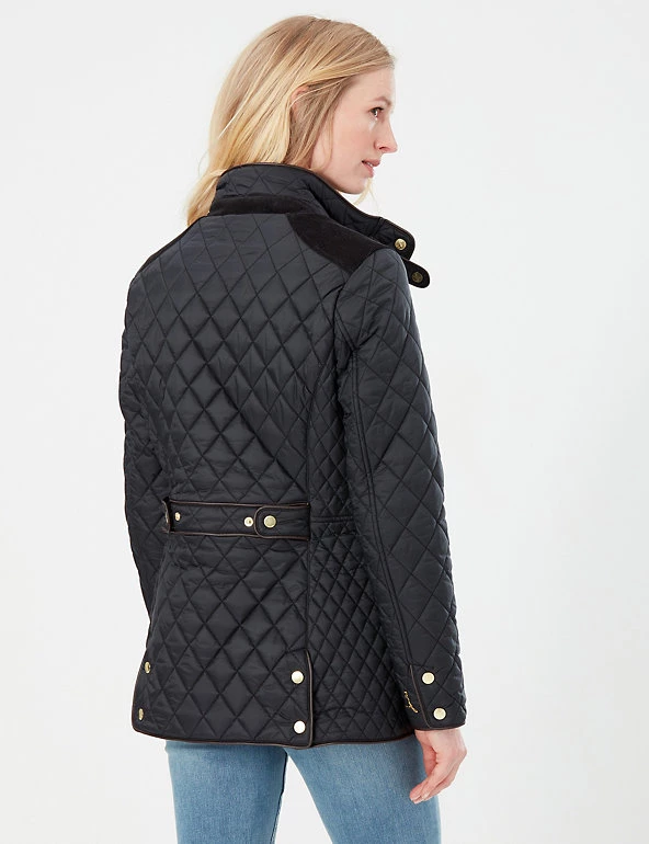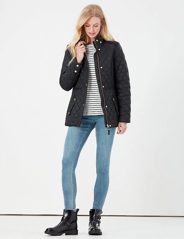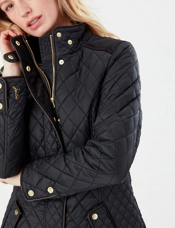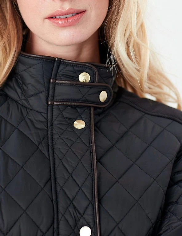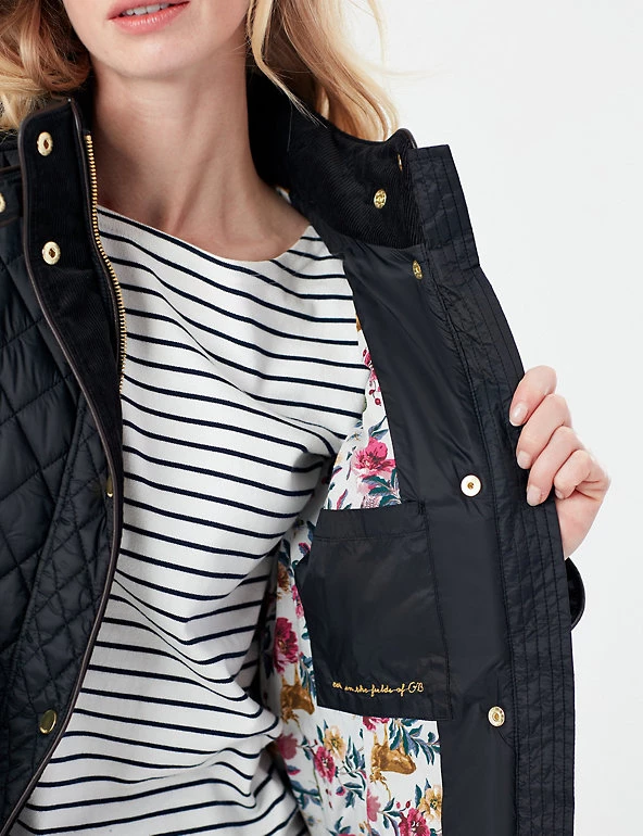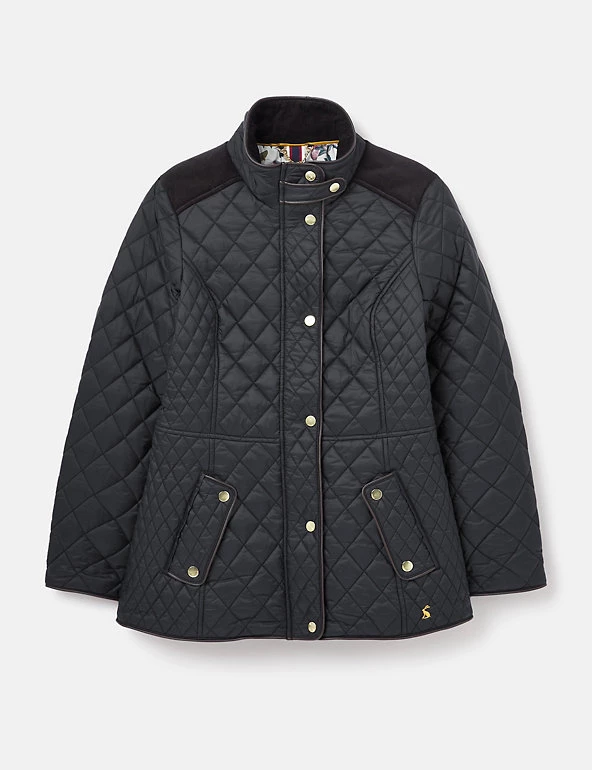 This warm quilted coat from Joules is perfect for relaxed winter days. It’s cut in a flattering slim fit, with a high neck and gold-tone popper buttons and zip fastening. Pockets sit on the front of the jacket, while two vents and an adjustable waistband feature at the back for comfortable wear. Contrast fabric across the shoulders adds texture, and a floral lining with a practical inside pocket provides the finishing touch. Made with recycled polyester.