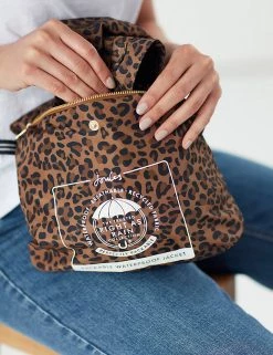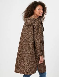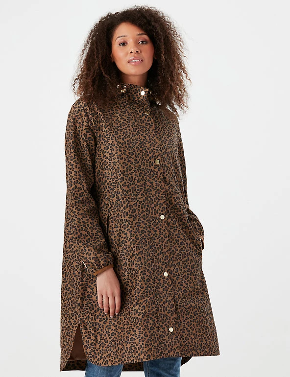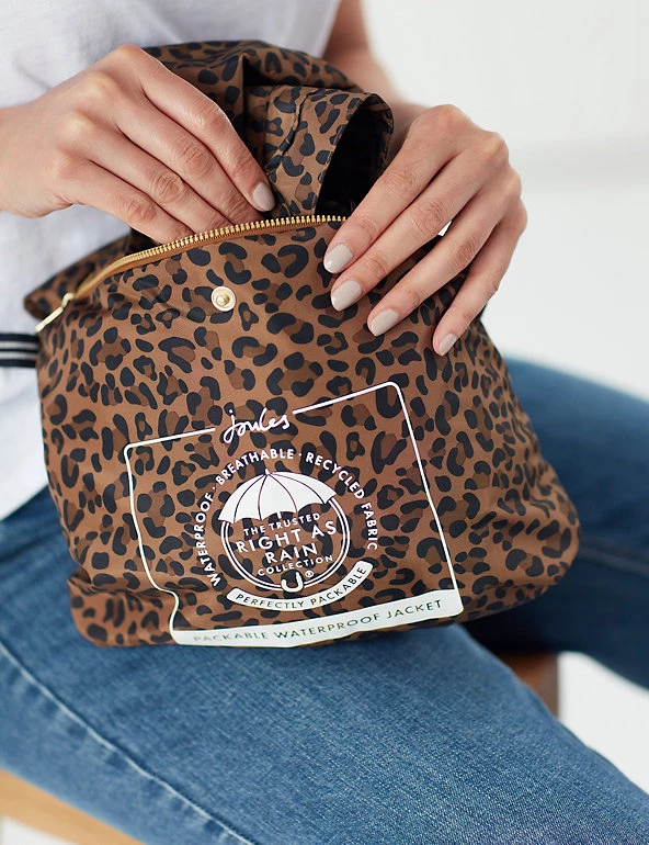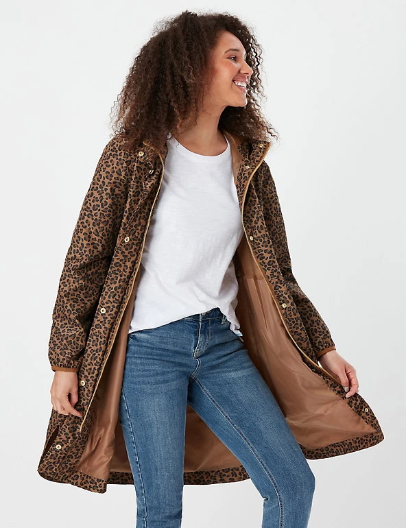 Stay dry and stylish when the rain pours with this leopard-print waterproof raincoat from Joules. Cut in a longline relaxed fit to easily cover any outfit, the coat features a mesh lining for breathability and a centre front zip. It includes elasticated cuffs and a storm peak hood with adjusters for extra snugness, as well as subtle welt pockets. The pack-away design means it can be easily stored until needed. Made with recycled polyester.