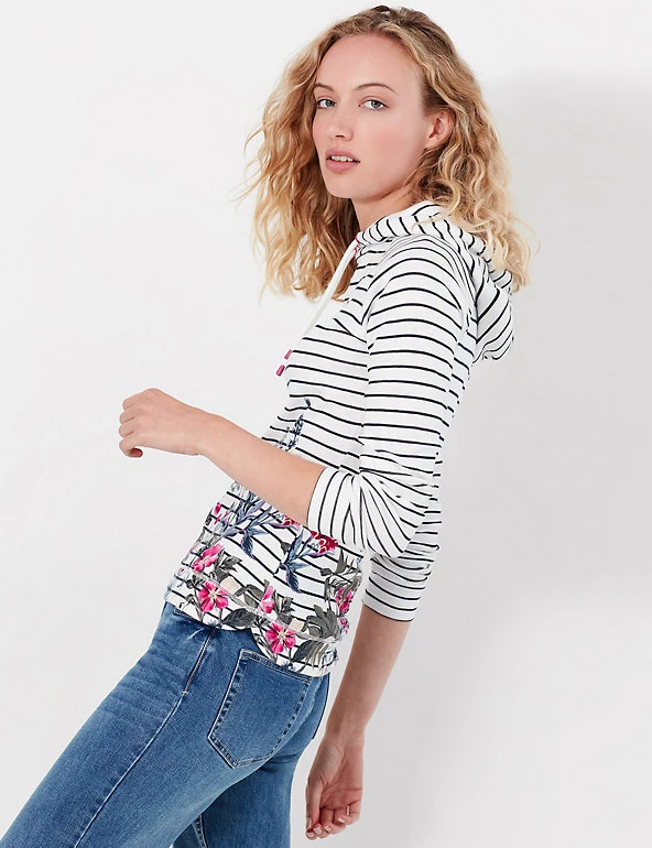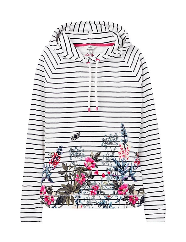 This pure cotton Joules sweatshirt puts a pretty spin on an off-duty staple. It’s designed in a regular fit, with a drawstring hooded neck and long sleeves. This piece features Breton stripes and a nature-inspired print, including flowers and a butterfly. It’s finished with tipping on the drawstrings and a front tab featuring the hallmark Joules hare.