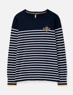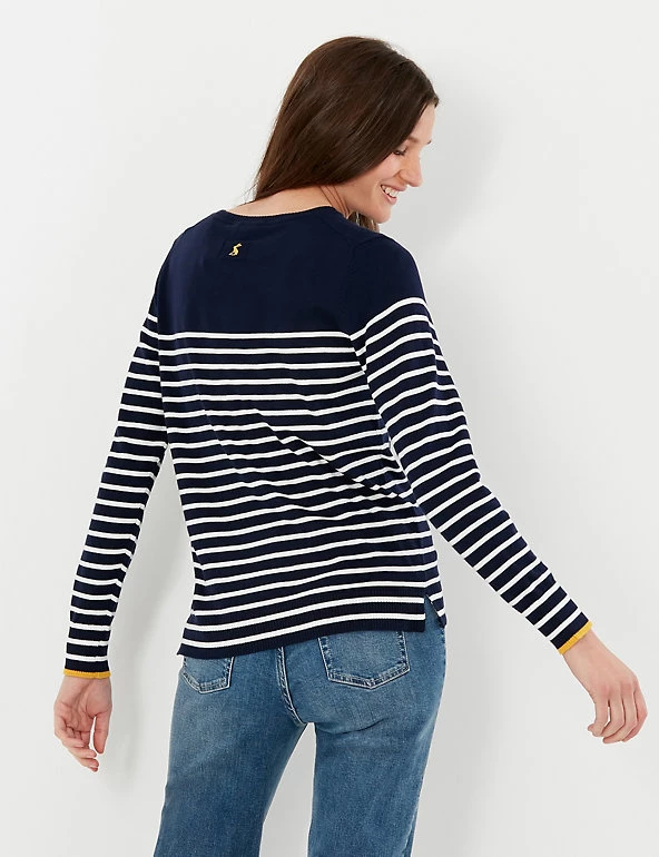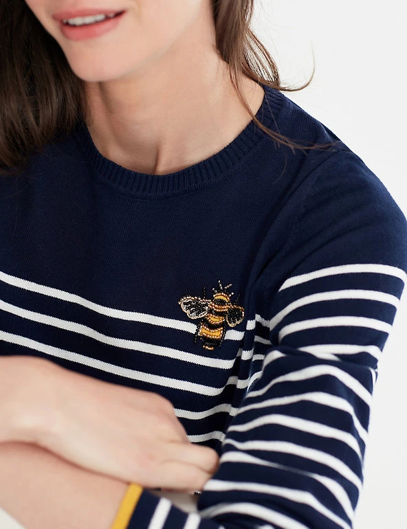 This cotton-blend jumper from Joules offers an elevated take on the staple, off-duty piece. It’s cut to a regular fit, with a classic crew neck and long sleeves. The striped design includes honeybee embellishment on the chest and tipping on the cuffs. The brand’s hallmark hare motif is embroidered on the back. Made with recycled polyester.