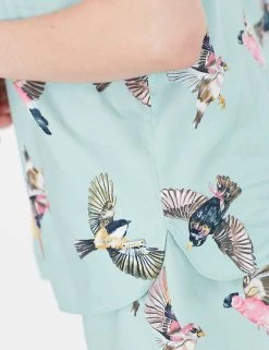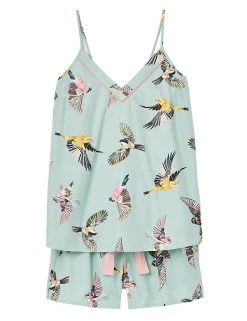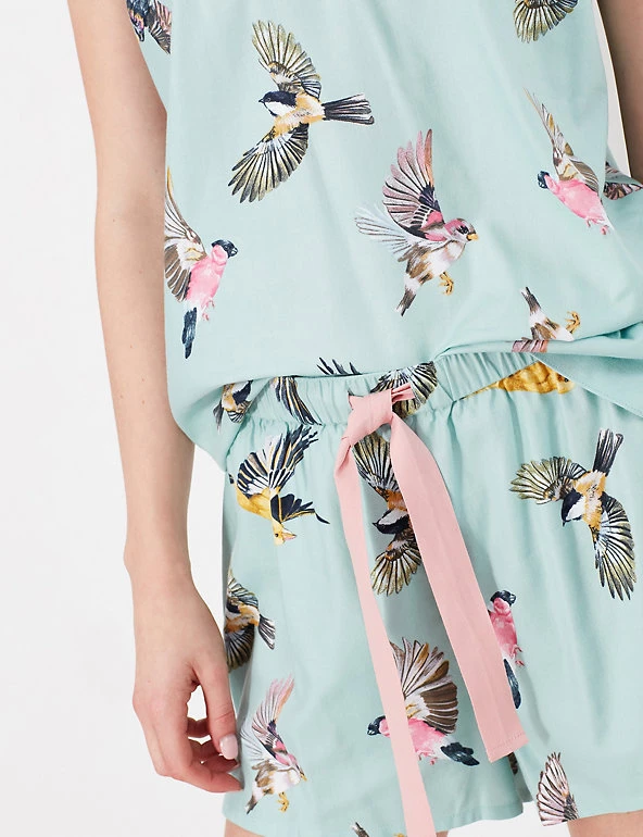 Feel fresh and cool on warmer nights in this cotton-rich pyjama set from Joules. The strappy camisole top has a striking all-over bird print and is finished with a piped trim at the neckline. The matching shorts feature a drawstring ribbon tie for dainty detail.