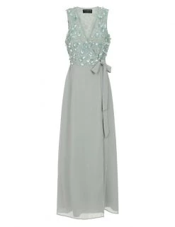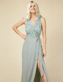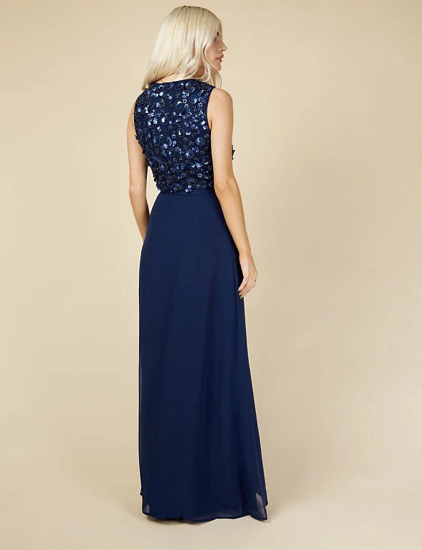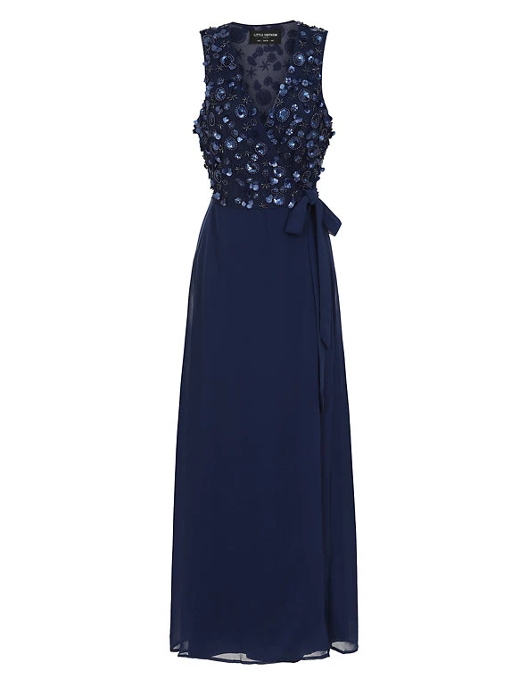 With its eye-catching embellishment and elegant shape, this dress from Little Mistress is perfect for weddings or proms. This regular-fit style is designed to flatter, with an elegant wrap silhouette and v-neck. The matching waist tie draws the eye to the maxi skirt, which has a glamorous side split. Each sequin and bead is hand-embellished for attention to detail.