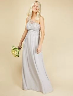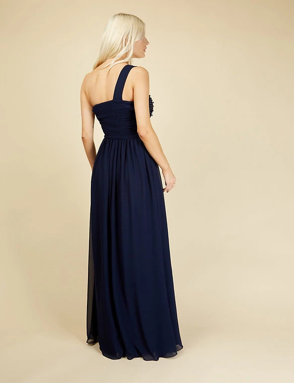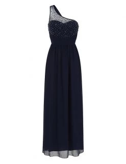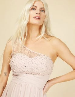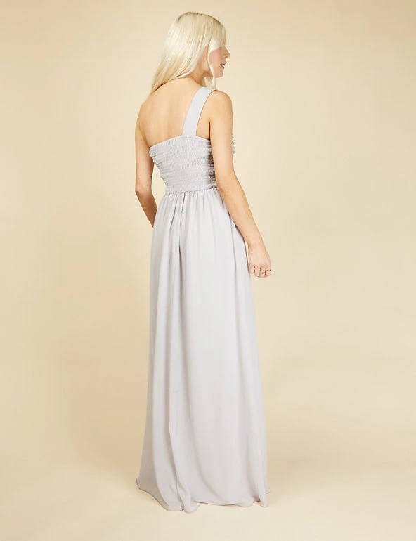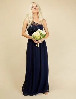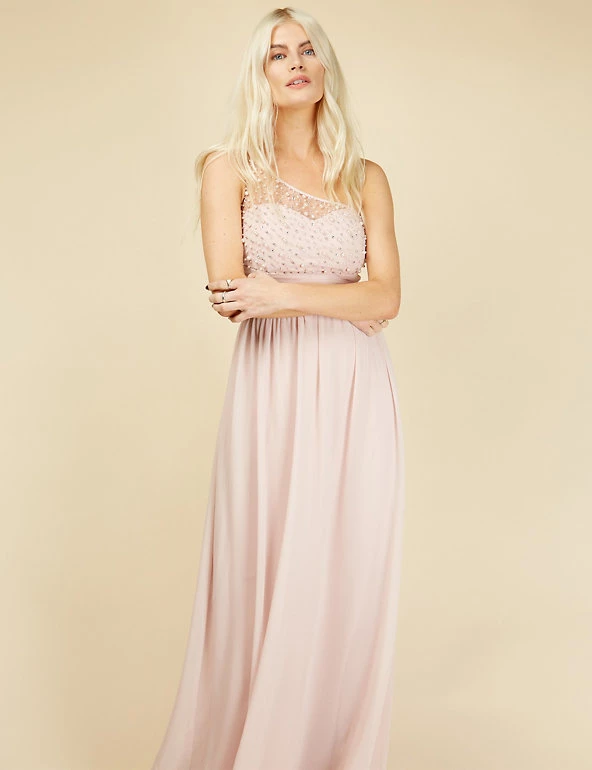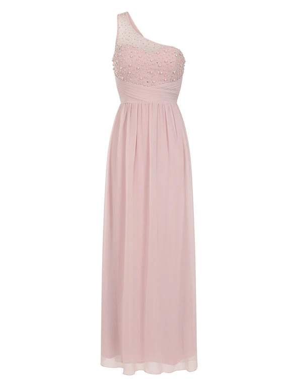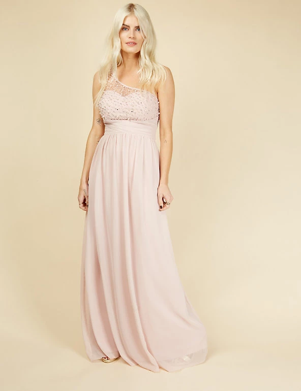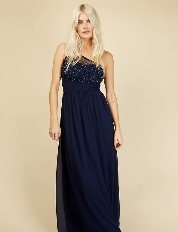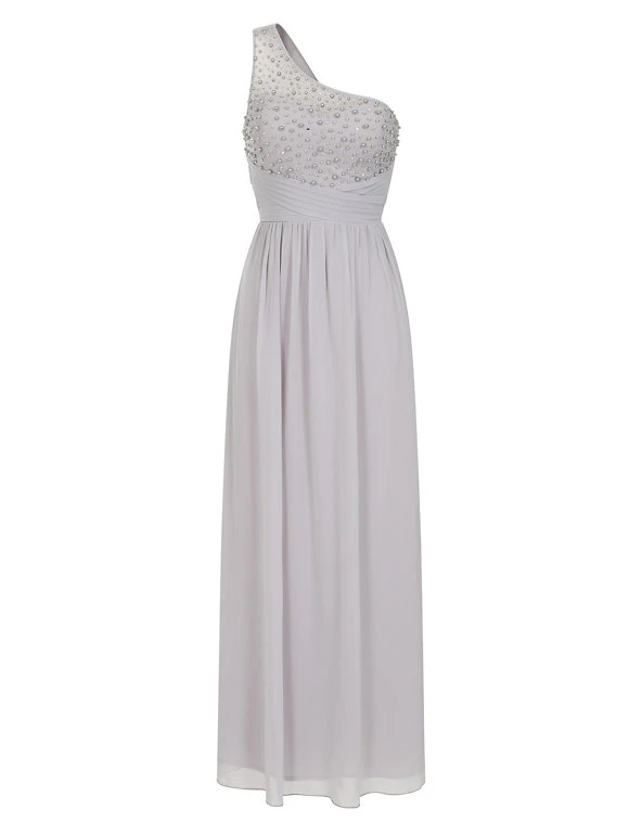 Feel glamorous on the most formal occasions in this elegantly cut dress from Little Mistress. It’s designed in a flattering regular fit. The flowing maxi length has crossover pleats at the waist to emphasise your figure, while the skirt is gently gathered for movement. A dramatic one-shoulder design is enhanced with a net overlay hand-embellished with pearly beads and glittering crystals.