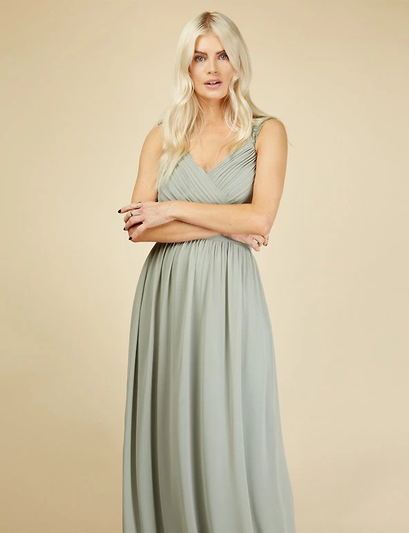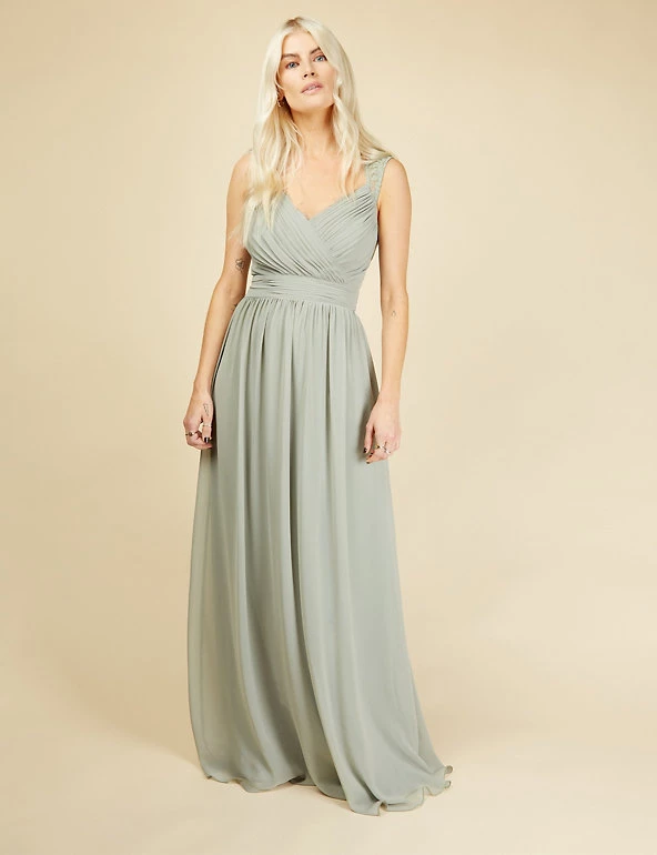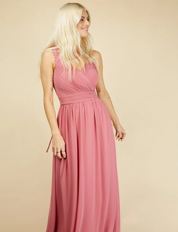 This stunning maxi dress by Little Mistress is the perfect choice for bridesmaids or prom queens. It’s cut to an effortless regular fit in a cool sleeveless shape. Designed to flatter, it features a waisted detail, wrap v-neck and a ruched waistband which is elasticated at the back for comfort. Romantic lace detailing on the shoulders extends to the back, where it’s finished with a tie and delicate scallop trim.