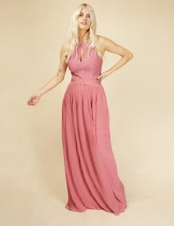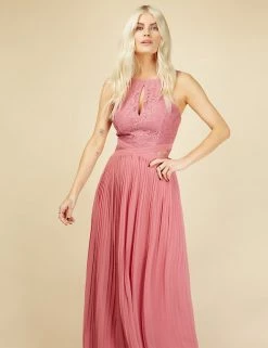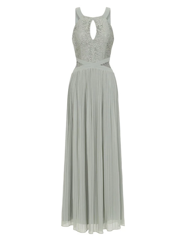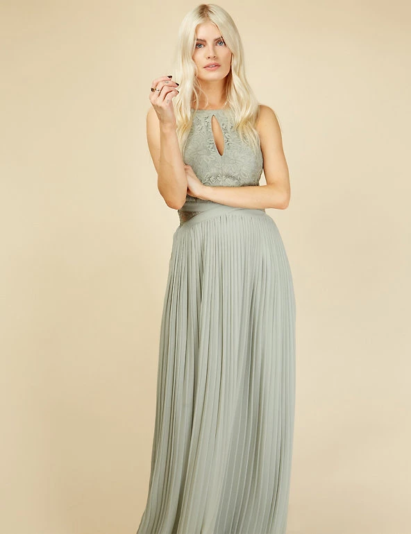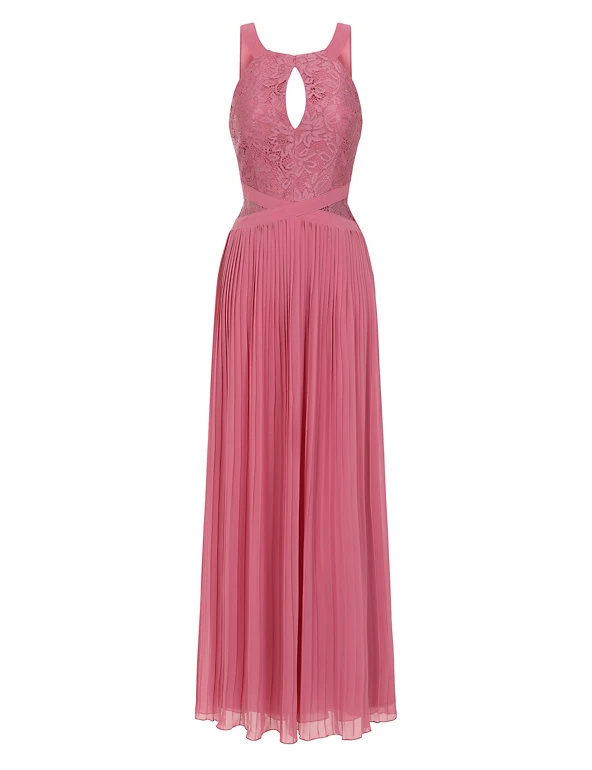 Bridesmaids and prom-goers will be sure to turn heads in this striking sleeveless maxi dress from Little Mistress. It’s cut in a regular fit with a sophisticated pleated skirt and a flattering criss-cross band around the waist. The lacy embroidered top features a keyhole slit beneath the round neck and sheer sides for an elegant effect. It’s fully lined for comfort.