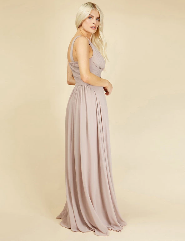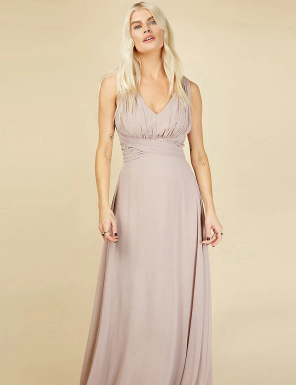 This stunning maxi dress from Little Mistress is pleated to perfection. Cut to a regular fit, this romantic v-neck style has a pleated bust for extra texture, and the waist is highlighted with a cross-over band. Ruching at the back provides a flexible feel, while touches of lace bring a romantic touch. This dress is the perfect choice for weddings or proms.
