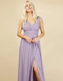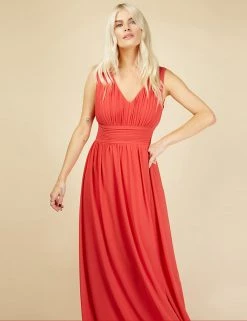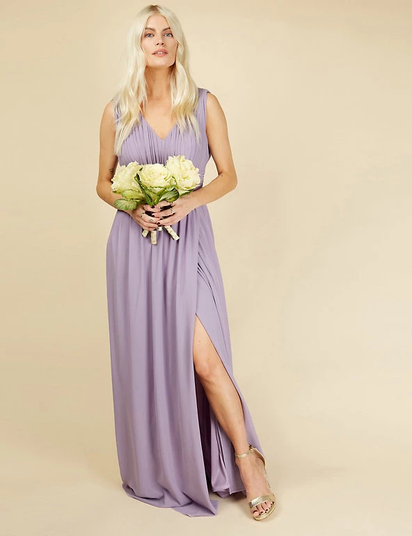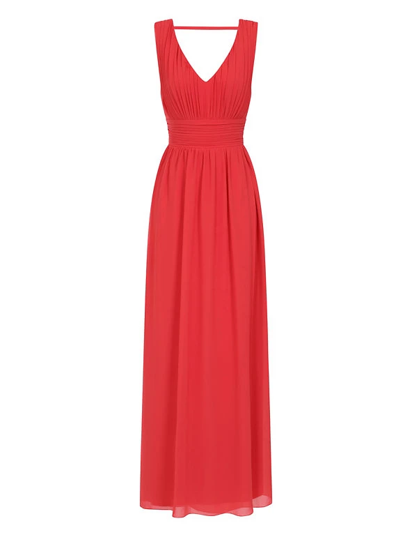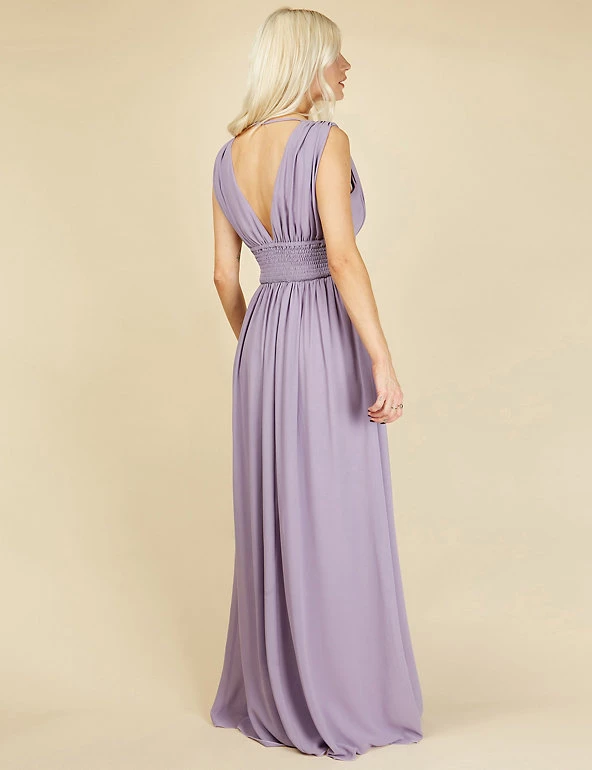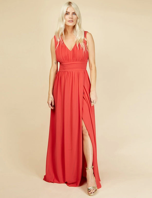 This stunning maxi dress from Little Mistress is an elegant choice for proms and weddings. It’s cut to a regular fit with a feminine plunge v-neckline and back. The bodice is detailed with pleats and has a matching waistband designed to flatter, plus shirred detailing at the back for your perfect fit.