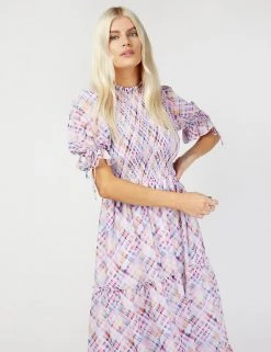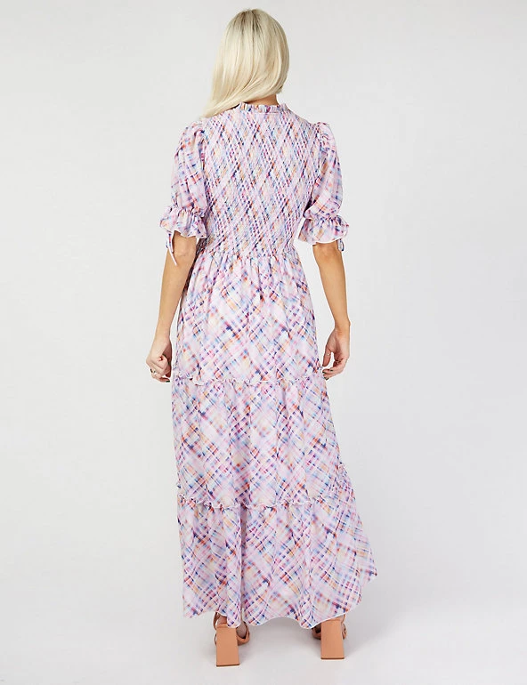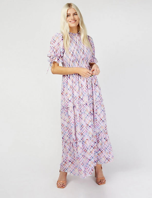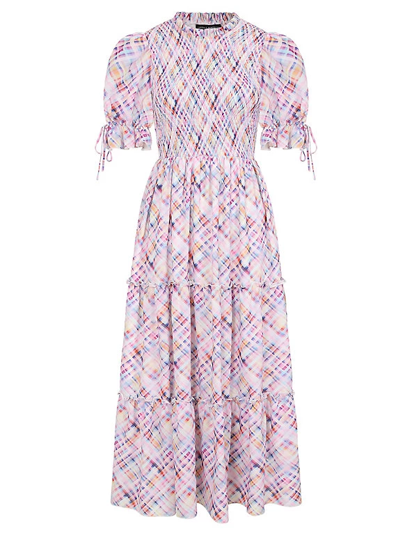Go for a fresh, feminine look with this midaxi dress by Vogue Williams X Little Mistress. Cut to a regular fit, this is an effortless yet entrance-making style. It features a flattering shirred bodice, plus short puff sleeves with tie detailing and a high neck for a modern touch. The skirt is tiered for a playful finish that perfectly complements the colourful check print.