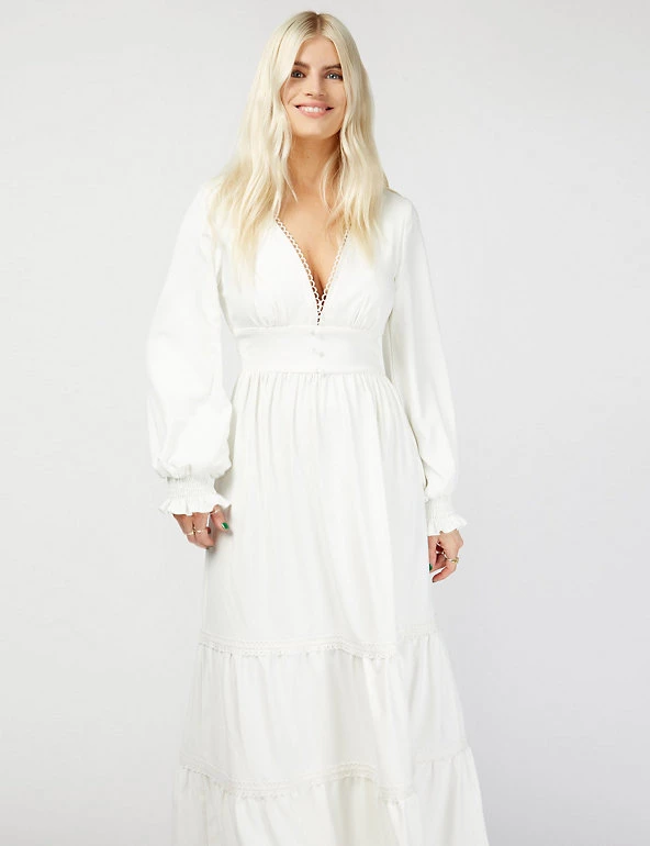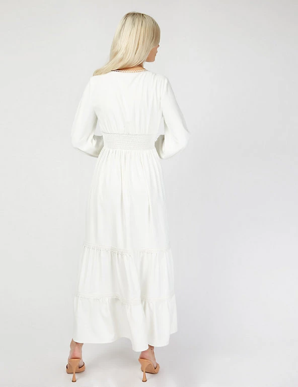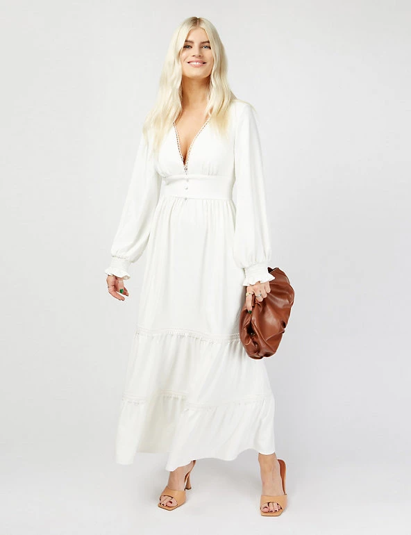 This floaty, feminine dress by Vogue Williams X Little Mistress is a perfect sunny day style. Designed to flatter, it comes in a regular fit with a v-neck and a panelled waistband which is shirred at the back. Elasticated cuffs add extra volume to the long sleeves and the midaxi skirt is tiered for extra movement. Crochet embroidery and covered buttons add the final touches.