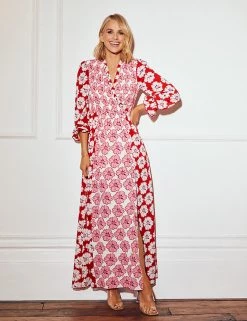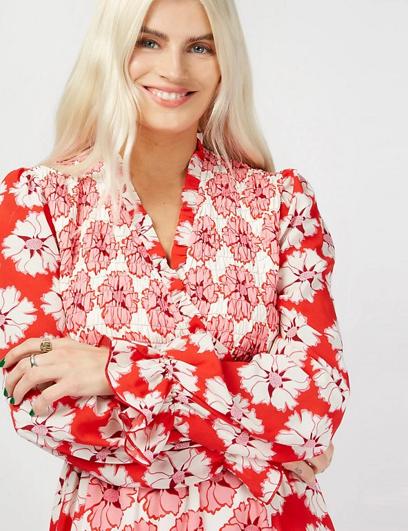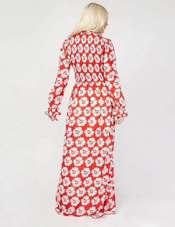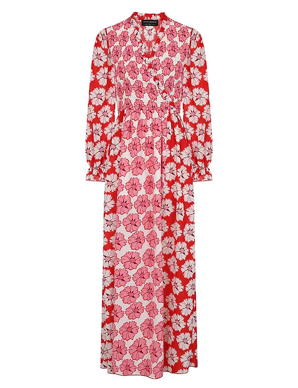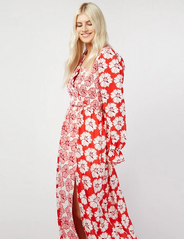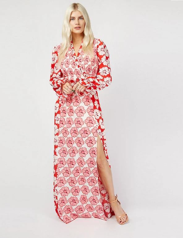 For an effortless event outfit, look no further than this tea dress by Vogue Williams X Little Mistress. This regular fit style features an elegant mock wrap, crafted from shirred fabric for a flattering finish. The long sleeves have frilled cuffs for a feminine touch, while a slit in the maxi skirt makes it evening-ready. The panelled floral print is perfect for sunny occasions.