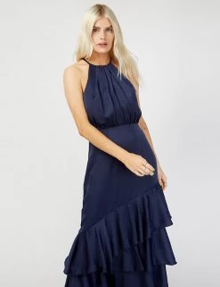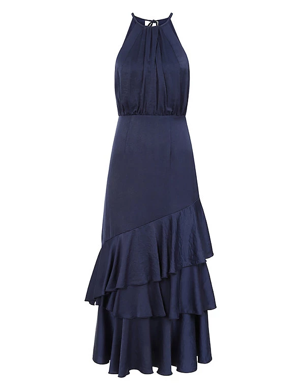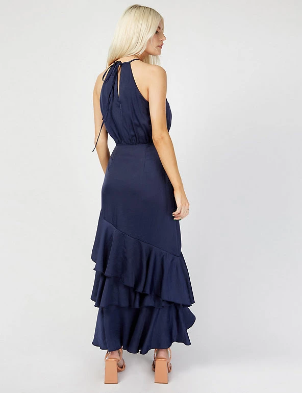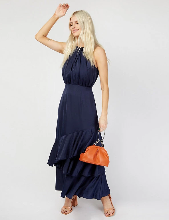 This satin dress by Vogue Williams X Little Mistress was made for big celebrations. Designed to flatter, it’s cut to a regular fit with a halterneck and waisted detailing. The modern midaxi-length skirt is tiered for extra volume and will look great on the dancefloor. This piece has a keyhole detail at the back and is finished with a concealed side zip fastening.
