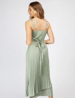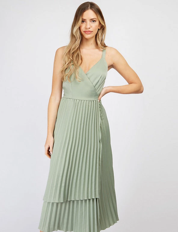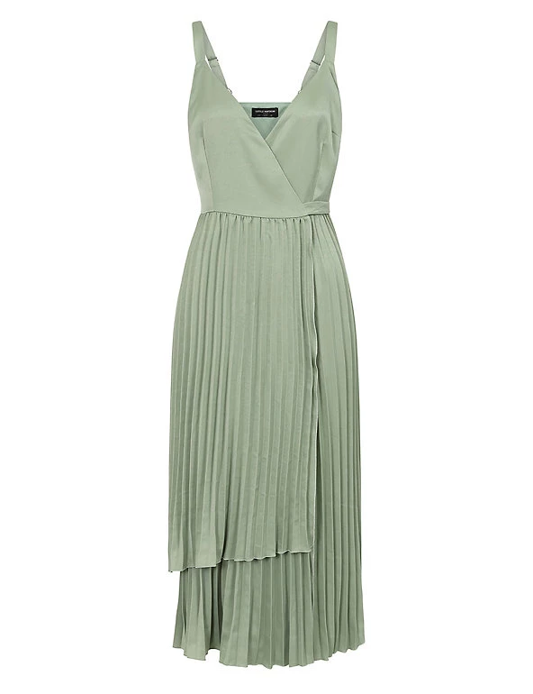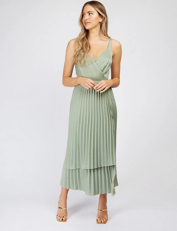 For a show-stopping occasion outfit, look to this gorgeous satin dress by Vogue Williams X Little Mistress. Cut to a flattering regular shape, this piece is designed with an elegant wrap bodice that ties at the side or back. The straps are adjustable for a perfect fit and the pleated midaxi skirt is layered for a modern touch.