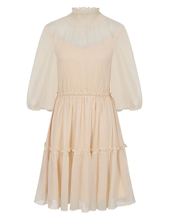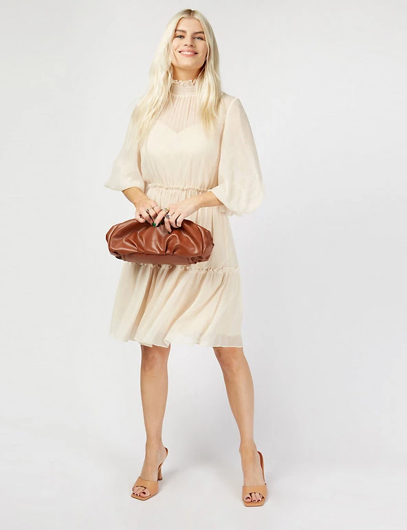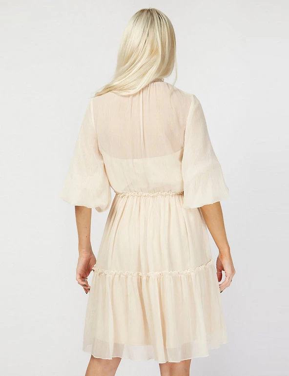 This mini dress by Vogue Williams X Little Mistress offers maximum style. Designed in a regular fit, this high neck piece features a subtle metallic thread for added shimmer. A semi-sheer bodice and puff sleeves give it a romantic feel, while the short skirt is tiered for a playful finish.