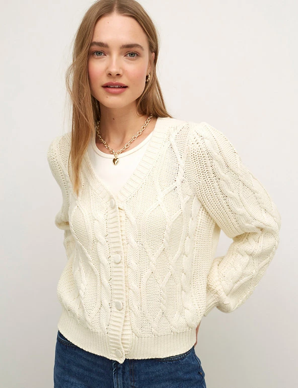 Bring a classic touch to outfits with this organic pure cotton cardigan from Nobody’s Child. It comes in a regular fit, with a v-neckline and snug ribbed trims. Cable knitting through the arms and front gives this piece a timeless look. Nobody’s Child designs are cut to a form-fitting shape, so if you’re looking for a more relaxed fit, we recommend choosing the next size up.