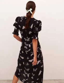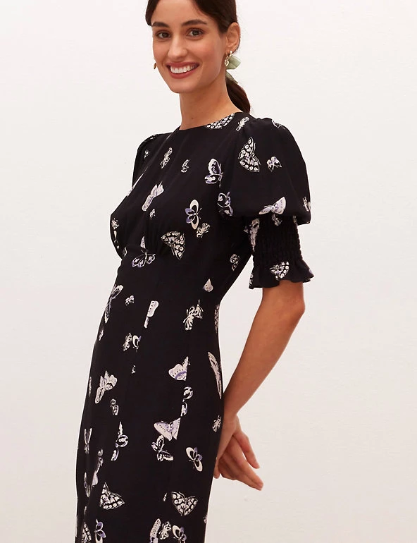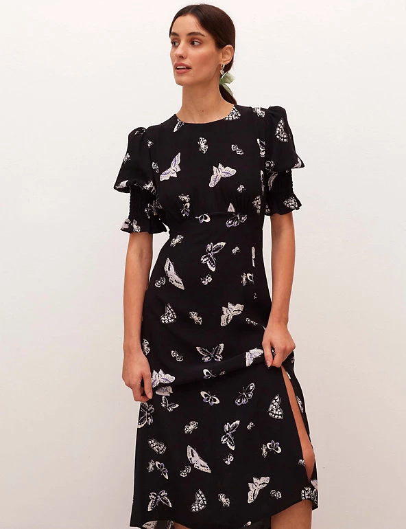 Flutter your way into events with this pretty butterfly-print dress by Nobody’s Child. It’s crafted in a regular fit, and the skirt falls to an on-trend midaxi length. A slit at the hem allows for easy movement. Deep shirred cuffs on the puff sleeves create an elegant fluted shape. This dress fastens with a discreet zip at the back. Made with sustainably sourced viscose.