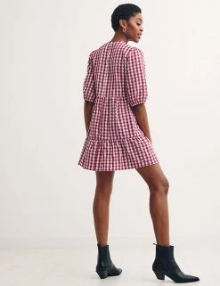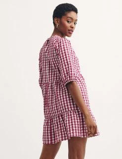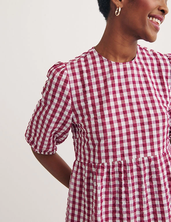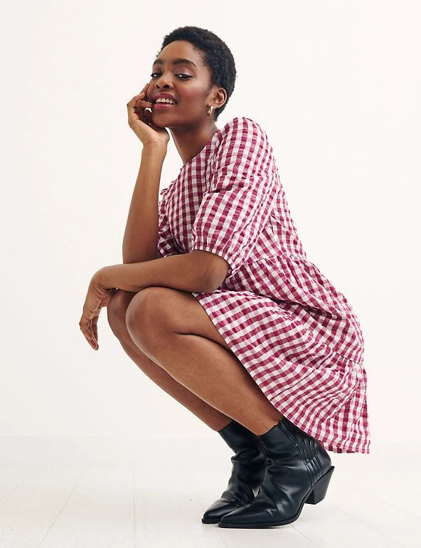 Be ready for the new season with this cotton-blend gingham smock dress from Nobody’s Child. This relaxed-fit style has a flattering tiered silhouette and a cool mini length with a frilled hem. Short sleeves and a round neck give it a neat finish. Made with recycled polyester.