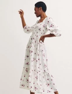 Dial up the romance in your wardrobe with this charming cotton-rich dress by Nobody’s Child. It’s designed with a fitted shirred body and a midi-length skirt with a billowy tiered hem. Voluminous puff sleeves and a square neckline with a frilled trim add to its whimsical aesthetic. A hint of linen in the fabric brings a breezy and breathable feel.