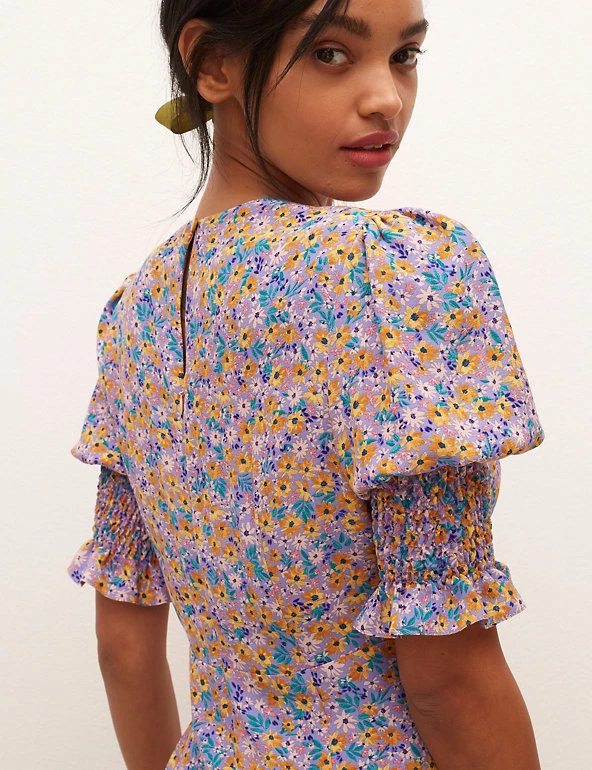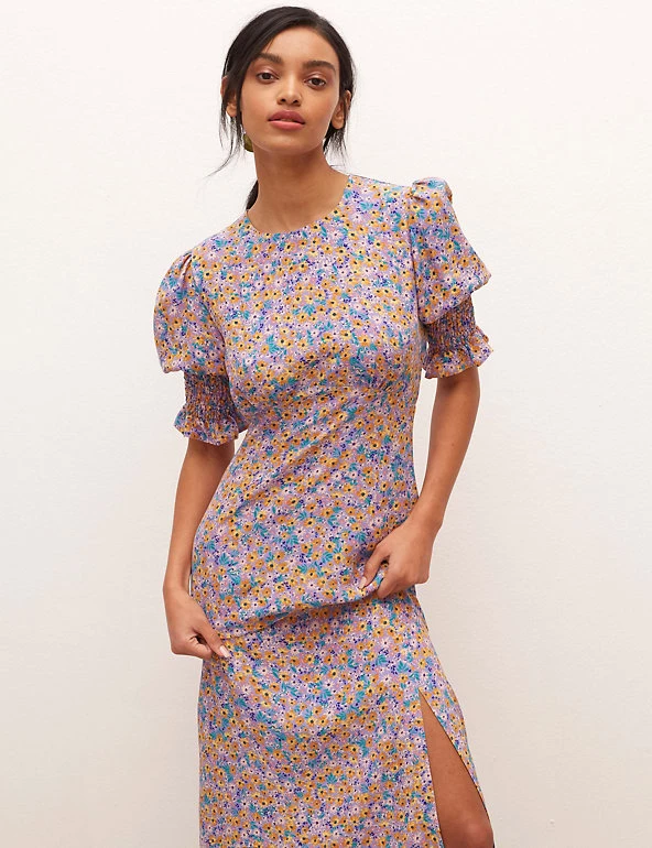 This waisted dress from Nobody’s Child takes you back to nature with its ditsy floral print. It features a traditional round neckline and is cut to a comfortable regular fit. The short puff sleeves have shirred cuffs for a romantic feel, which is emphasised by gathers under the bust. A split in the midaxi length skirt gives the dress flirty appeal. The dress fastens with a discreet back zip and a button at the nape. Made with sustainably sourced viscose.