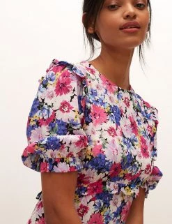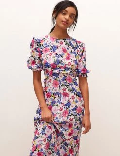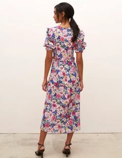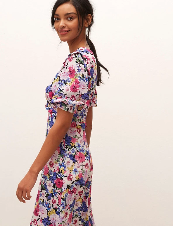 Bursting with beautiful blooms and detailed with frills at the waist and shoulders, this Nobody’s Child tea dress has a nostalgic air. It is made in a comfy regular fit, with a simple round neck and short puff sleeves. This dress sits at a flattering midaxi length and fastens with a zip at the back. Made with sustainably sourced viscose.