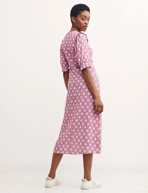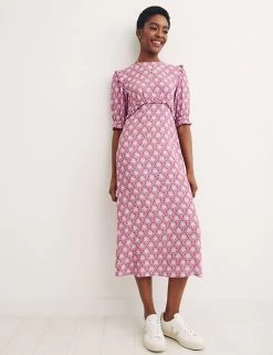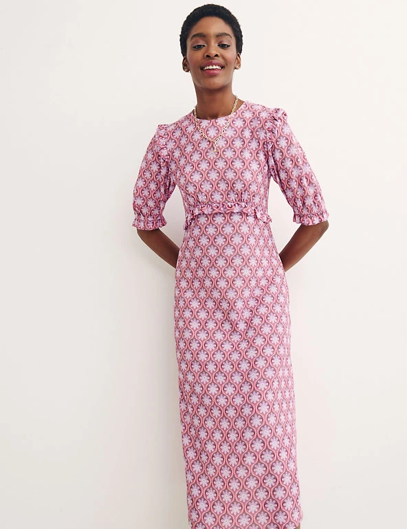 With its geometric floral print, this Nobody’s Child midaxi dress is perfect for sunny days out. It’s cut to a regular fit, with a classic round neck and short puff sleeves. Frill detail on the sleeves and waistline adds a feminine flourish. This piece fastens with a zip at the back. Made with sustainably sourced viscose.