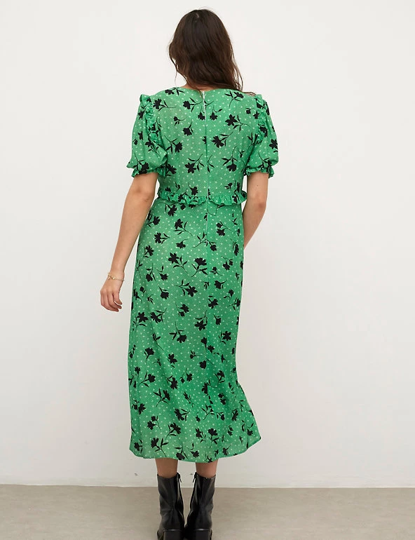 This tea dress by Nobody’s Child catches the eye with its fresh floral and polka dot print. It’s designed in a regular fit and falls to an on-trend midaxi length. Frill detailing on the waist and gently puffed short sleeves add to the softer aesthetic of the dress. A simple round neckline and discreet back zip complete the piece. Made with sustainably sourced viscose. Nobody’s Child designs are cut to a form-fitting shape, so if you’re looking for a more relaxed fit, we recommend choosing the next size up.