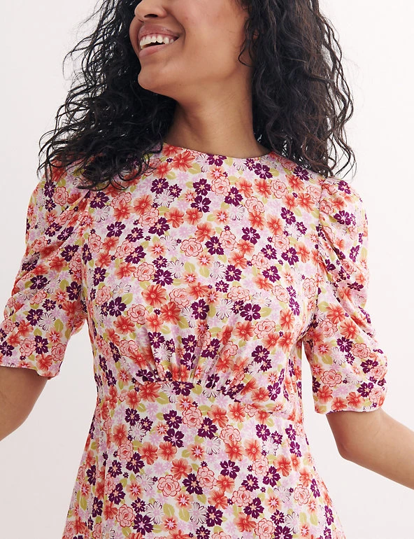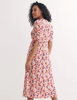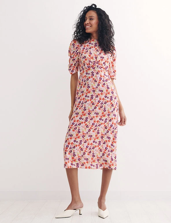 Your next summery occasion calls for this colourful floral dress by Nobody’s Child. Its regular fit, empire waist and midi length combine to create an elegant silhouette. Ruched short sleeves lend welcome volume to the slender shape. Made with sustainably sourced viscose. Nobody’s Child designs are cut to a form-fitting shape, so if you’re looking for a more relaxed fit, we recommend choosing the next size up.