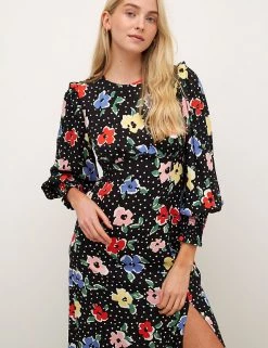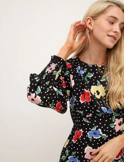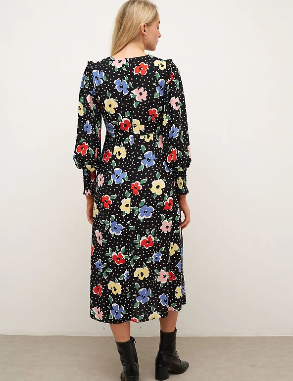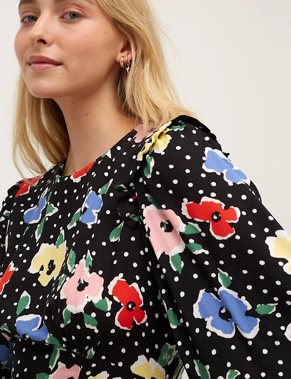 With a vibrant print featuring florals and polka dots, this Nobody’s Child tea dress has modern appeal. Cut to a regular fit, it’s designed with an easy round neckline and falls to an on-trend midi length. This piece has long blouson sleeves with shirred cuffs and ruffles on the shoulders for a feminine flourish. It features a slit at the front and fastens with a zip at the back. Made with sustainably sourced viscose.
