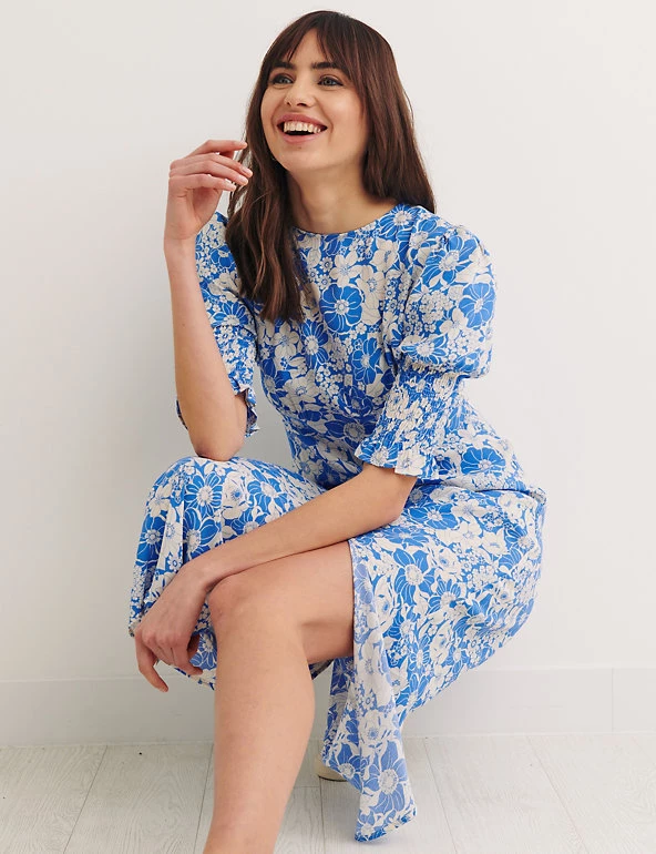 Dial up the elegance for your next social occasion by slipping into this striking floral dress from Nobody’s Child. Cut to a midi length, this regular fit piece features short sleeves with deep shirred cuffs for a romantic air. A simple round neck gives a refined look, while the keyhole and button fastening at the back adds a pretty touch. There’s also a discreet back zip for convenience. Made with sustainably sourced viscose.