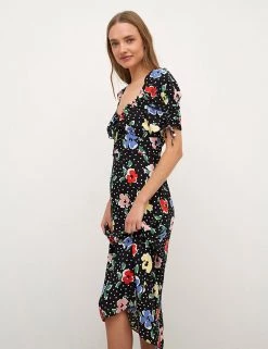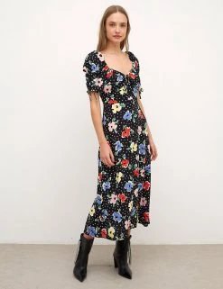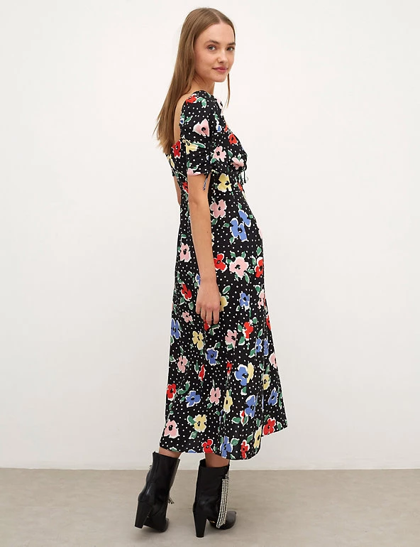 Bright florals meet polka dots to create this vibrant midaxi tea dress from Nobody’s Child. It’s cut in a regular fit with an elegant sweetheart neckline and tie detailing. The short puffed sleeves create subtle volume and are finished with gathered drawstring detail. Made with sustainably sourced viscose.