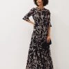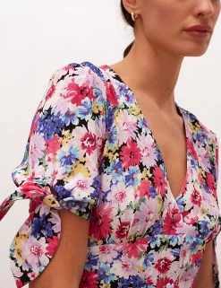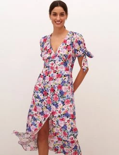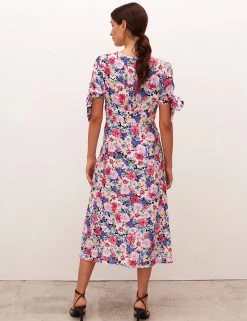 Flourish in florals with this charming tea dress by Nobody’s Child. It’s made in a fitted silhouette, with a middle panel to highlight the waist. The short sleeves feature romantic ties at the cuffs. Covered buttons down the front and a v-neckline add a final touch of elegance to this summery midi dress. Made with sustainably sourced viscose.