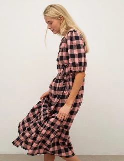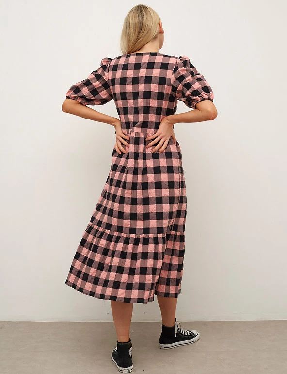 Elevate your smart-casual wardrobe with this midaxi wrap dress from Nobody’s Child. It’s cut in a comfy regular fit with an elegant v-neck and double tie at the waist, plus an internal tie for an adjustable wear. The tiered smock skirt creates a relaxed silhouette, and the short puff sleeves add volume. Made with sustainably sourced viscose.