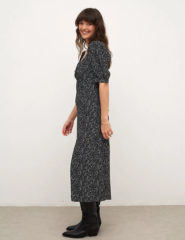 Add this Nobody’s Child tea dress to your wardrobe for an instant pop of print. It’s cut to an effortless regular fit with a ruched sweetheart neckline. The short puff sleeves add extra volume, and a side slit on the midaxi length skirt brings a flirty finish. This piece has a waist tie at the back and a concealed zip fastening. Made with sustainably sourced viscose. Nobody’s Child designs are cut to a form-fitting shape, so if you’re looking for a more relaxed fit, we recommend choosing the next size up.