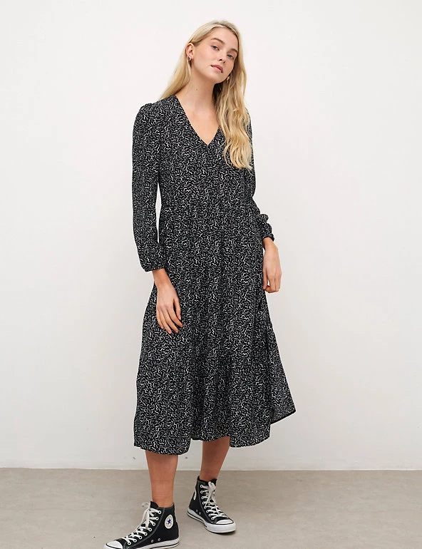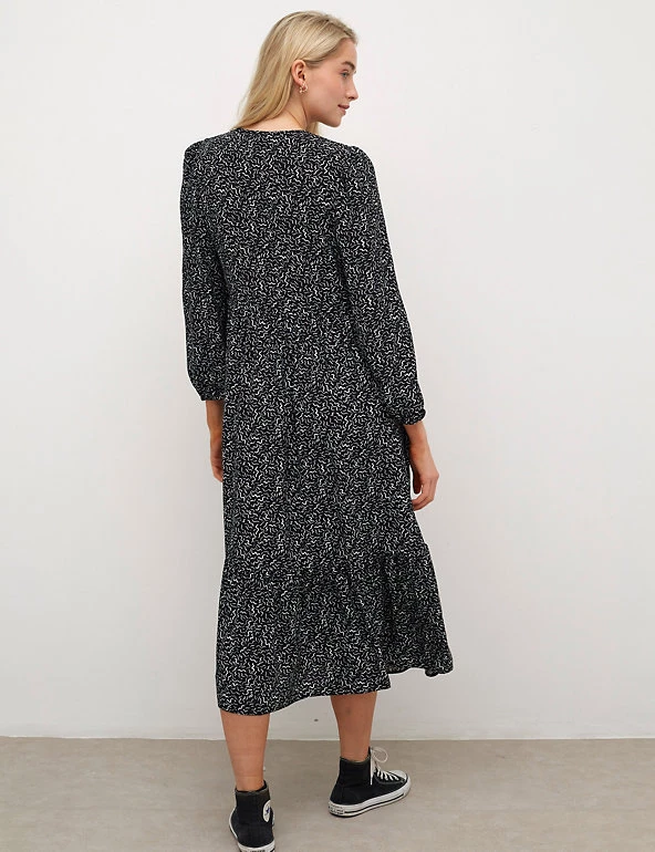 Look to this Nobody’s Child tea dress for a fresh print you can wear both day and night. This fitted style is designed to flatter, with a classic v-neck and long blouson sleeves for extra volume. The on-trend midaxi skirt features a playful tiered hem, and an all-over graphic print keeps this piece feeling modern. Made with sustainably sourced viscose.