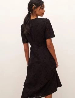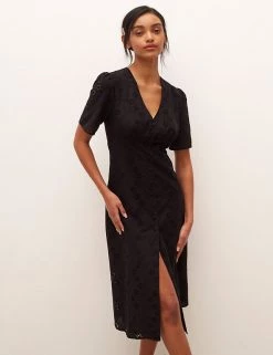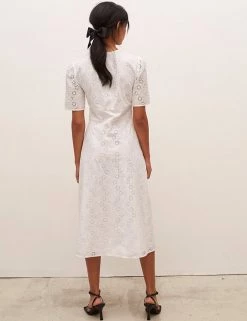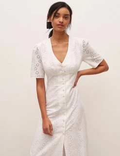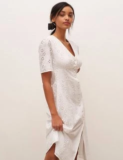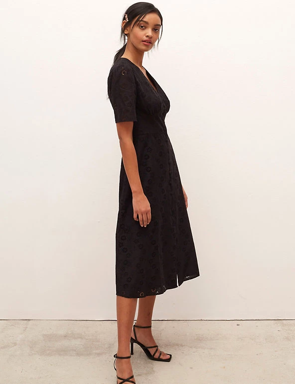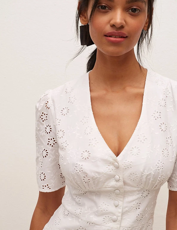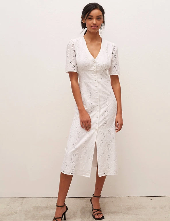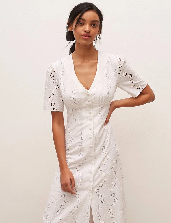 The LBD gets a dainty update with this pure cotton broderie design by Nobody’s Child. It’s cut in a flattering fitted shape, with a button-through front and waist-cinching panel in the middle. Short puffed sleeves offset the plunging v-neckline. A slit at the midi hem makes moving in the dress easier. Nobody’s Child designs are cut to a form-fitting shape, so if you’re looking for a more relaxed fit, we recommend choosing the next size up.