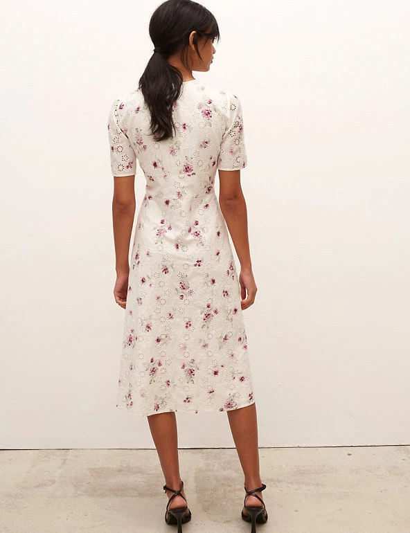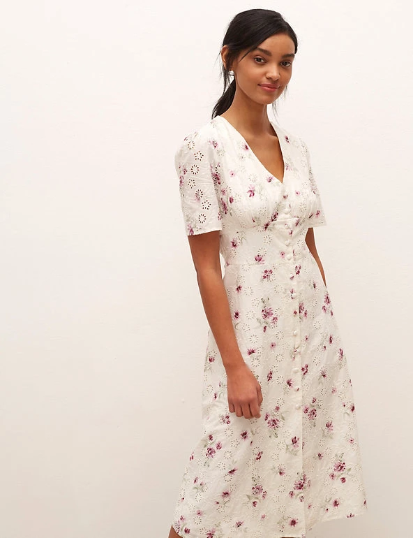 Breathable pure cotton fabric and all-over florals make this Nobody’s Child dress primed for picnics and other summery moments. It comes in a flattering fitted cut, with a button-through front and figure-defining waist panel. Short sleeves and a v-neckline lend an elegant look. It’s complete with broderie cut-outs throughout, with a lining to the body for coverage. Nobody’s Child designs are cut to a form-fitting shape, so if you’re looking for a more relaxed fit, we recommend choosing the next size up.