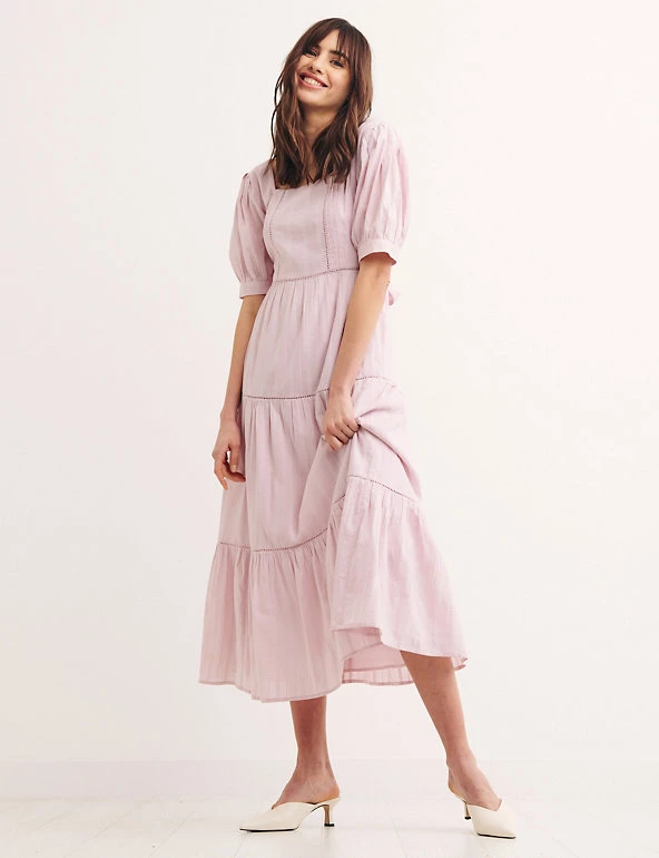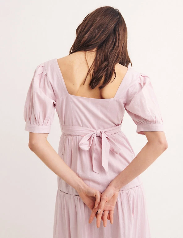 Put a vintage-inspired spin on your occasion look with this pure cotton smock dress by Nobody’s Child. Designed in a comfortable relaxed fit, this twirl-worthy piece features a flattering square neck, breezy short sleeves and a midi-length hem. Delicate tiering and a bow-tie fastening at the back give it an extra feminine twist. Nobody’s Child designs are cut to a form-fitting shape, so if you’re looking for a more relaxed fit, we recommend choosing the next size up.