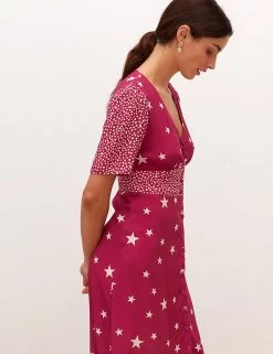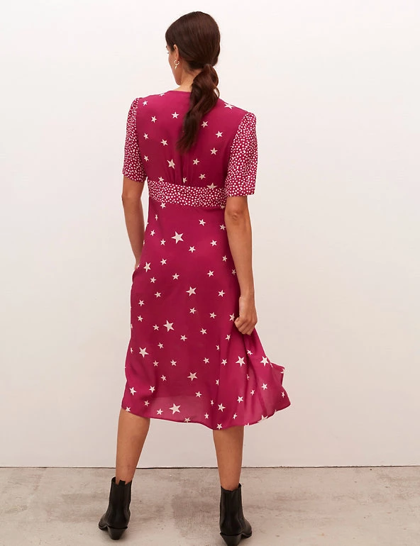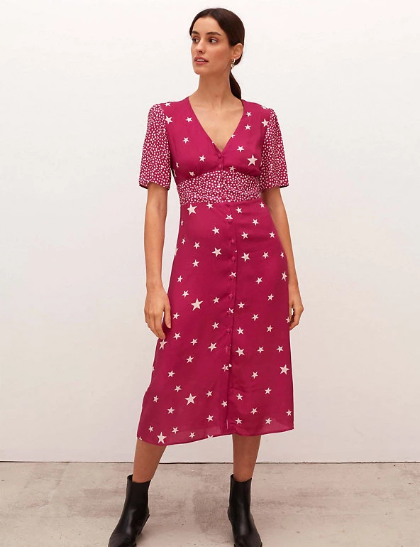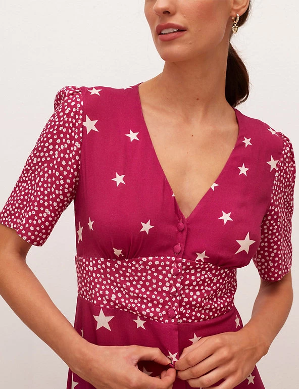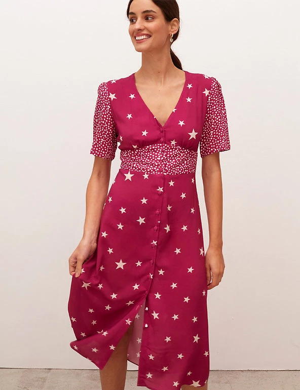 Add a cosmic touch to your smart-casual looks with this star print tea dress from Nobody’s Child. It has a fitted shape, a flattering v-neckline and covered buttons down the front. The short sleeves and shaped waist panel feature a contrasting star print. The skirt falls to an elegant midi length. Made with sustainably sourced viscose.