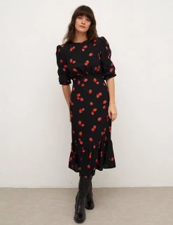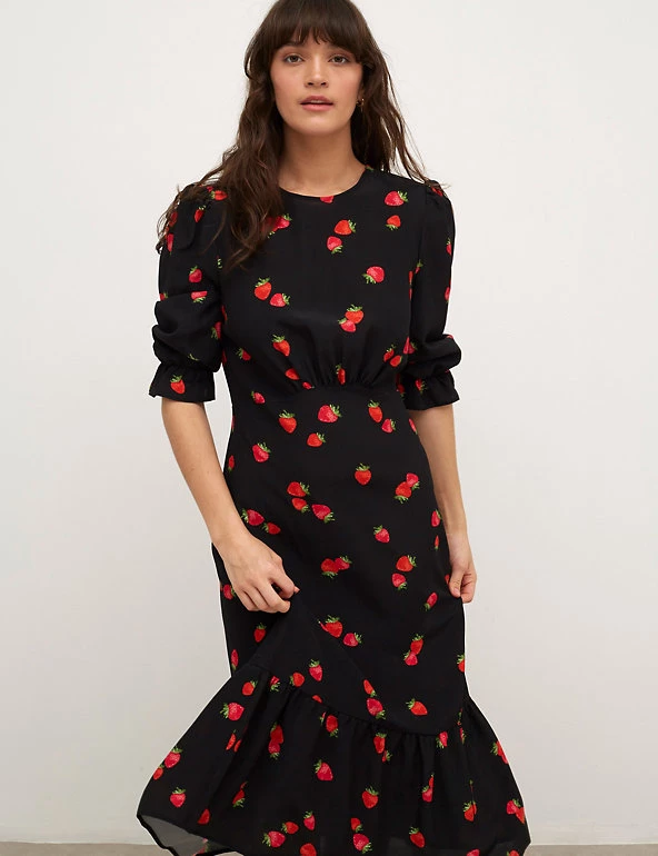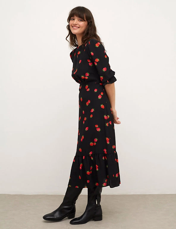 Embrace playful patterns with this delicious strawberry-print dress from Nobody’s Child. Cut in an easy regular fit, the dress features three-quarter sleeves with a feminine puffed shape. An empire shaped waist accentuates your figure and the fluted midaxi-length skirt adds movement. It’s finished with a simple round neckline and a back zip with keyhole fastening. Made with sustainably sourced viscose.