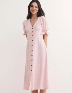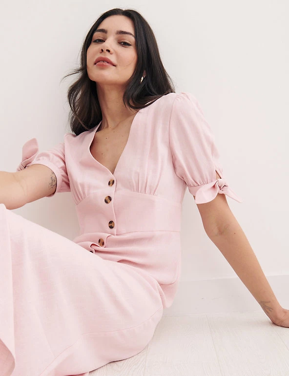 A flowing silhouette and hint of linen give this Nobody’s Child dress a breezy feel. It has a fitted cut with a waist-defining panel. A classic tea dress style, it comes with an elegant v-neckline, button-through front and drapey midi skirt. Short sleeves with a tie add extra charm to this summery number. Made with sustainably sourced viscose.