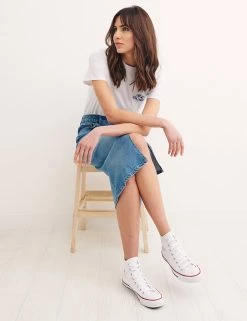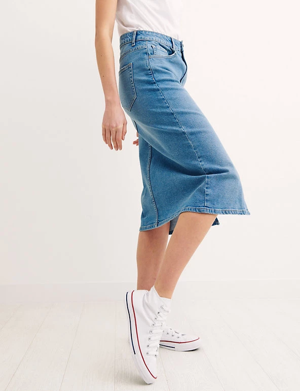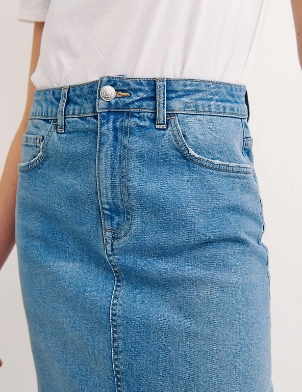 Update your go-to staples for spring with this denim skirt from Nobody’s Child. This casual style is cut to a flattering midi length and fastens with an easy zip with button closure. It’s finished with classic five-pocket styling and has an embroidered logo at the back. Made with organic cotton.