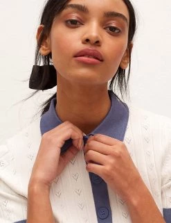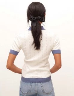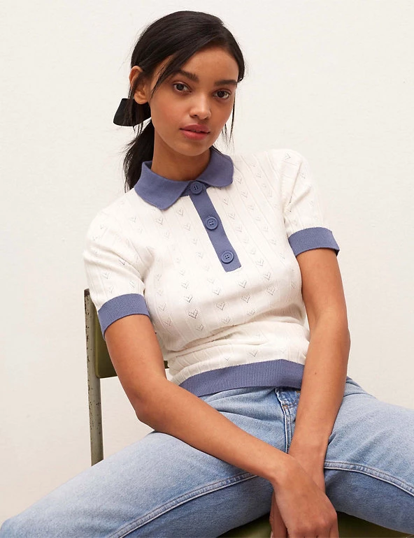 Evoke a preppy vibe with this collared knitted top by Nobody’s Child. It’s designed in a regular fit, with short sleeves and a classic button placket. Contrast trims create a bold look, while the heart-shaped pointelle detail lends a playful touch. Made with sustainably sourced viscose.