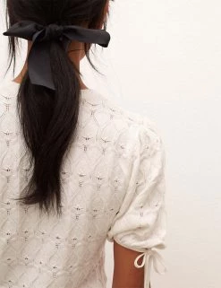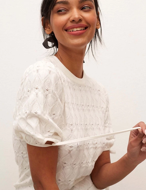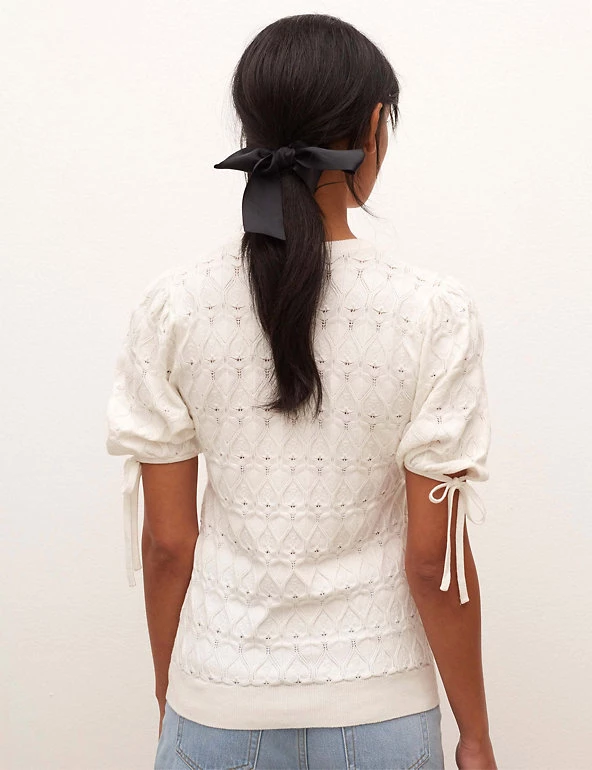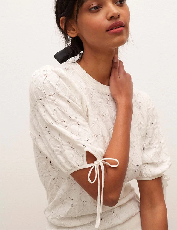 Take an elegant approach to knitwear with this dainty short-sleeve top from Nobody’s Child. It’s crafted in a regular fit, with a round neckline and snug ribbed trims. Pointelle detailing throughout adds intricate texture, while bows on the sleeves lend a final touch of elegance. Made with sustainably sourced viscose.