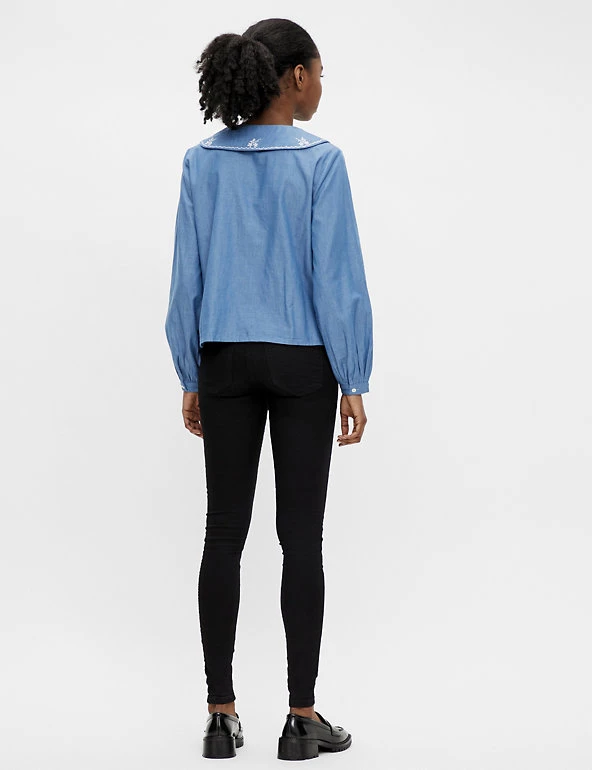 Lend some prairie charm to your wardrobe with this pure cotton top from OBJECT. It’s cut in a relaxed fit, with a button-through front and elegant v-neckline. Blouson sleeves and a statement collar with embroidery add a romantic feel.