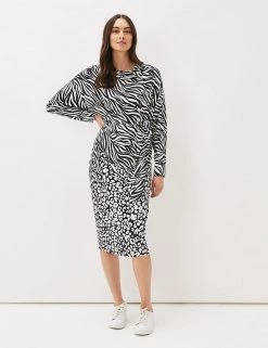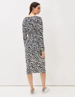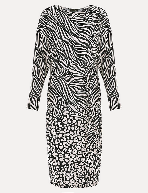 This Phase Eight dress has a mix of leopard and zebra prints for a standout look. It’s designed in a comfortable regular fit, in an elegant shift shape. A drapey cowl neck and an on-trend knee-length hemline enhance the feminine feel. The long sleeves are cuffed for extra smartness, and a tie belt at the waist flatter your figure.
