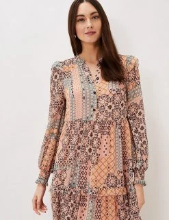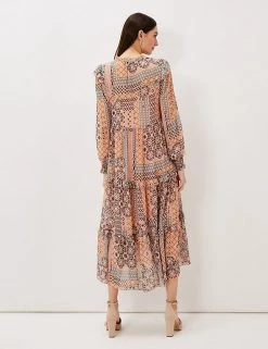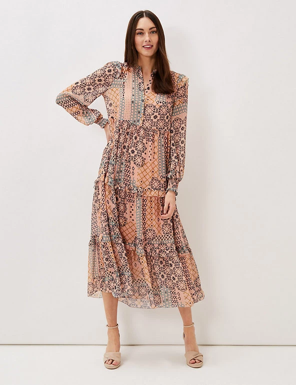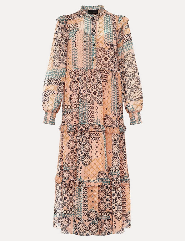This chiffon dress from Phase Eight combines a statement geometric print with a flowing tiered shape for a strikingly elegant finish. Its relaxed fit ensures an unstructured silhouette that’s emphasised by fluttery frills at the shoulders and a midaxi-length skirt. A v-neckline and button-up bodice create a neat look and shirred cuffs give volume to the long sleeves. This dress is fully lined for extra coverage.