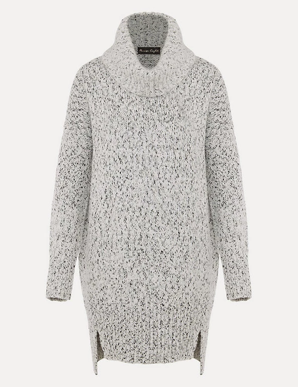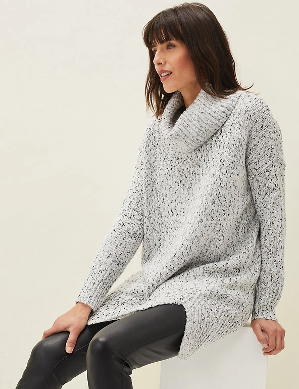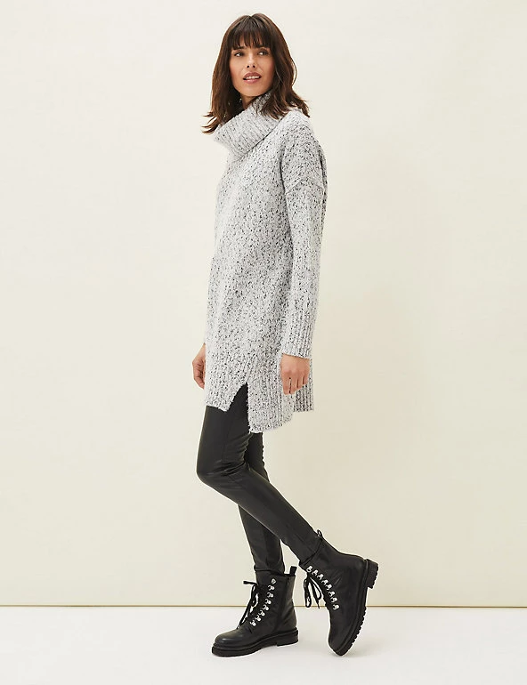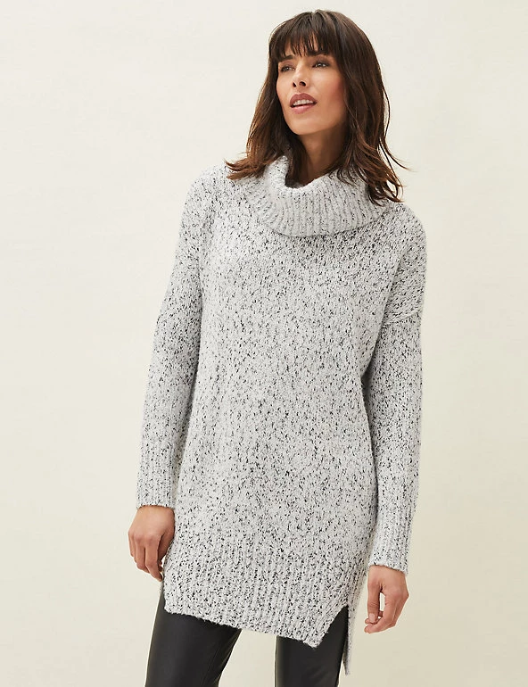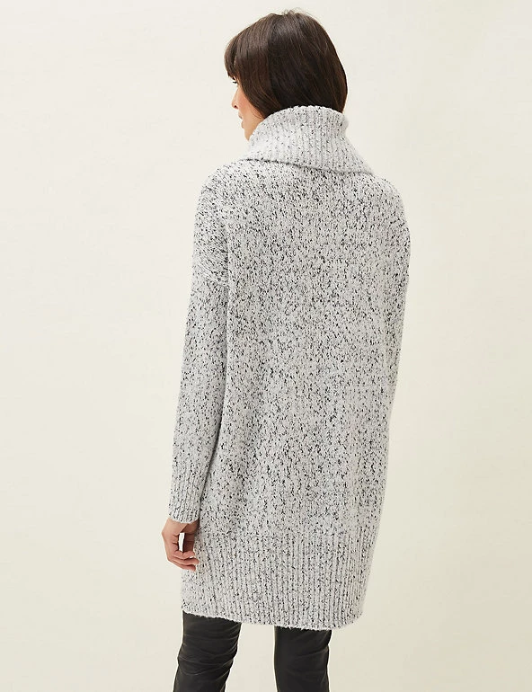 The cotton-rich yarn for this Phase Eight jumper dress is made with colour-contrast flecks for a subtly textured look. This versatile dress is knitted in a comfy regular fit, with a snug roll neck and knee-length hemline. Deep ribbed trims at the wrists ensure the warmth stays in, and a split hem gives extra freedom to move. A touch of wool creates an extra cosy handfeel.