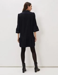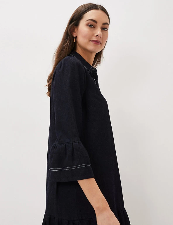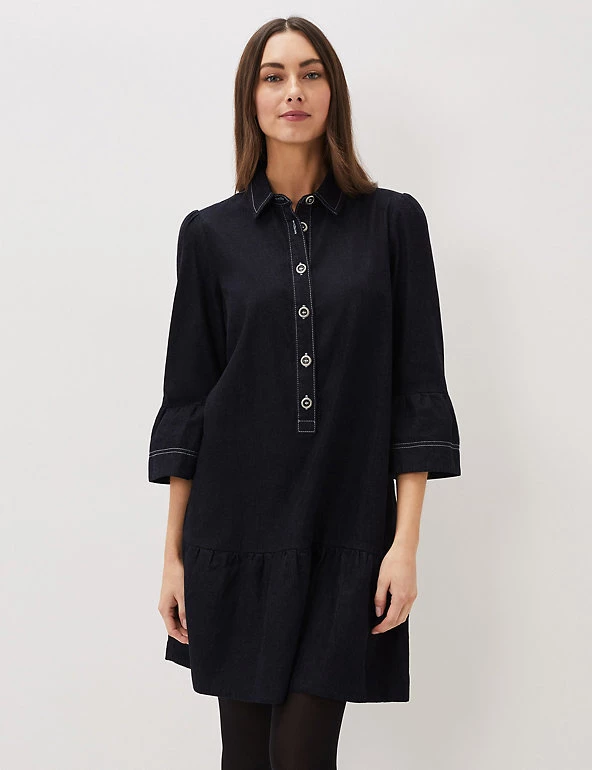 This easy shift dress from Phase Eight is made from pure cotton denim for a casual feel. It’s cut in a comfortable regular fit with a deep frill at the mini-length hemline to add pretty movement. Crisp detail comes from the button-up bodice and collared neckline, and the three-quarter sleeves are finished with feminine frilled cuffs and top-stitched embroidery.