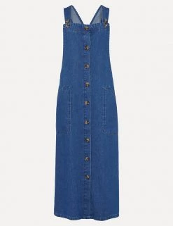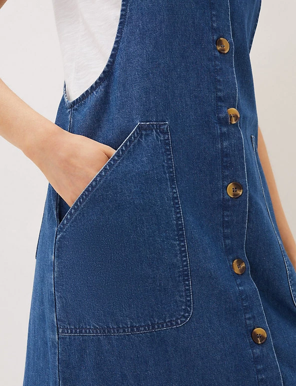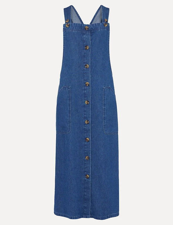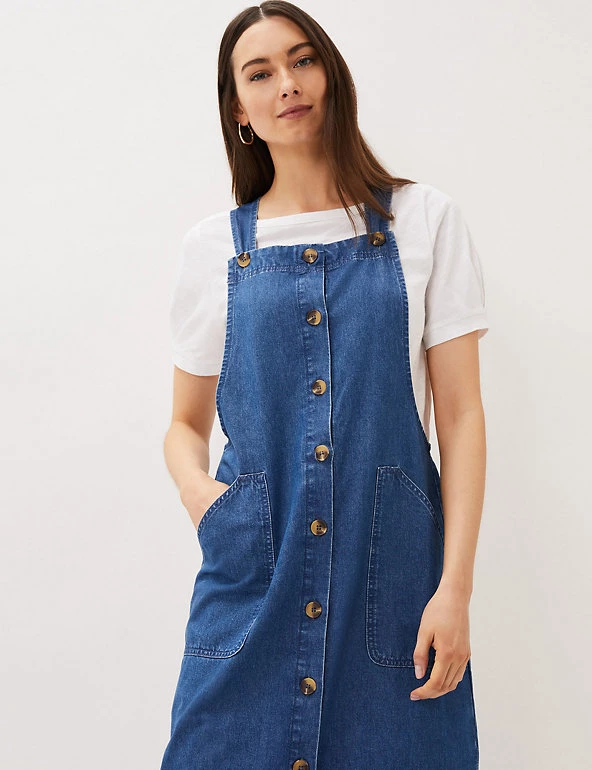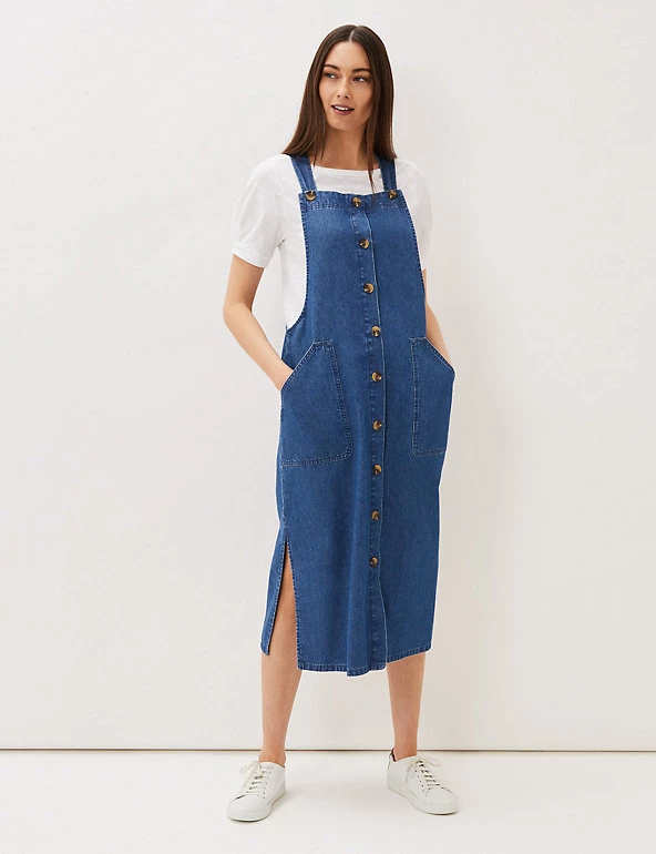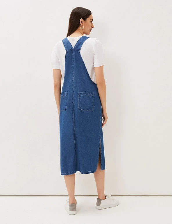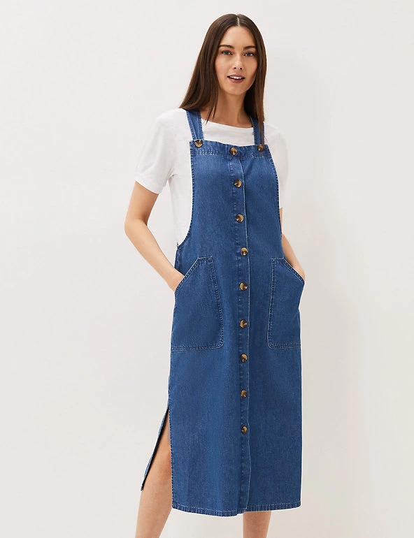 Add to your denim collection with this pure cotton pinafore dress from Phase Eight. This strappy, square neck style was made for layering and is cut to a regular fit for all-day comfort. It fastens with tortoiseshell buttons and has handy pockets at the sides and back. The midi-length hem has side splits for flexible wear. This brand is proud to invest in making cotton production more sustainable.