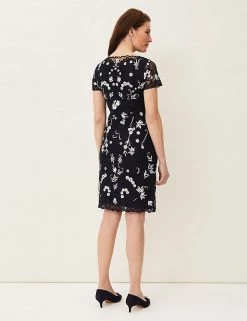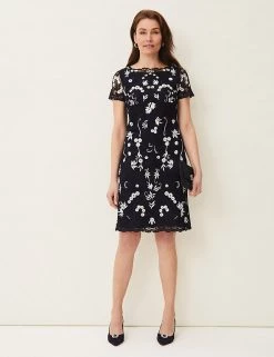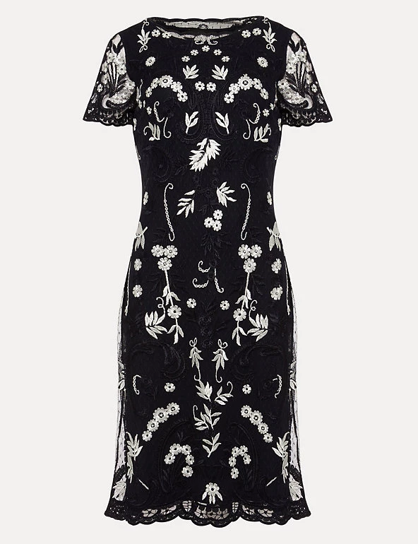 Be the belle of the garden party in this intricately embellished dress. Regular fit, in a flattering shift shape that finishes at the knee. The embroidered floral lace overlay features pretty scalloped edges at the round neck, the hem and the delicate short sleeves. It has a back zip fastening, and is fully lined for comfort.