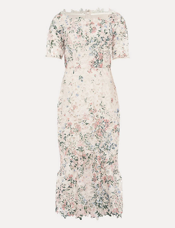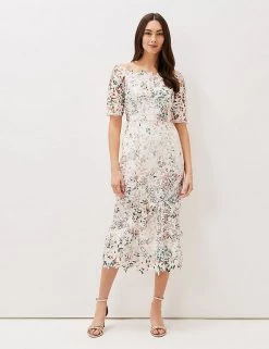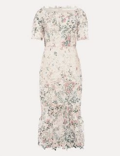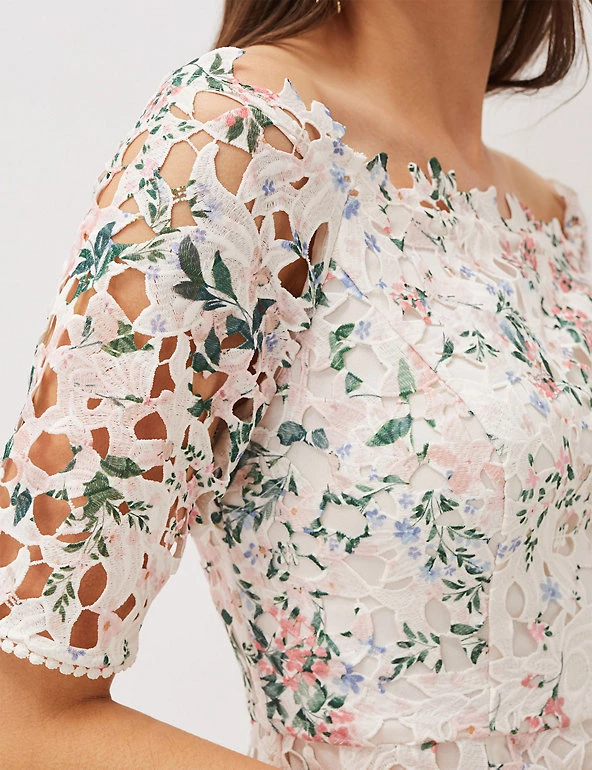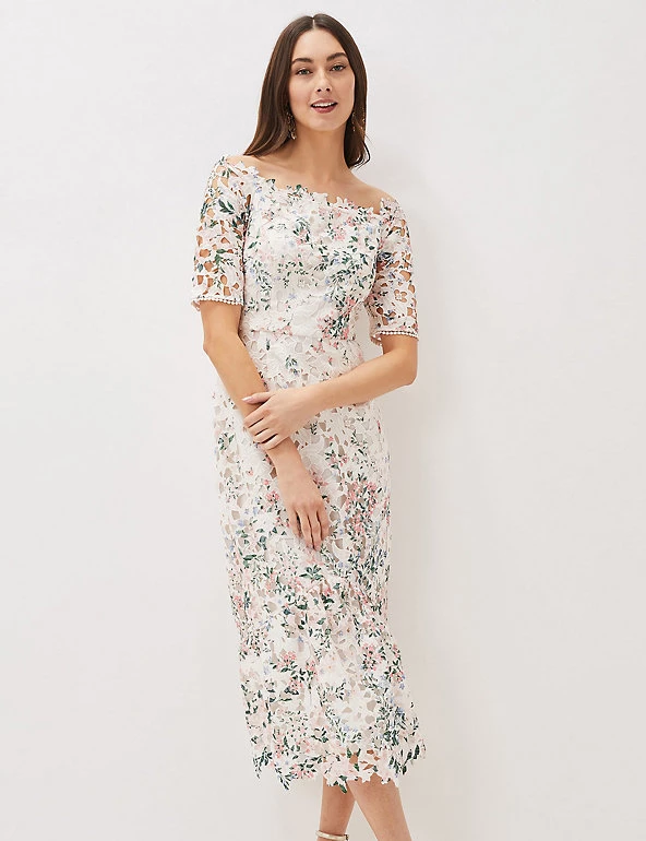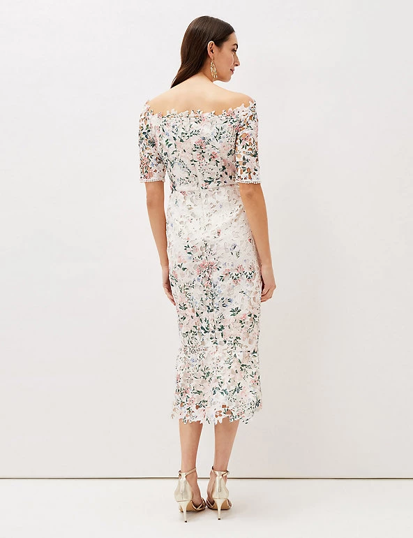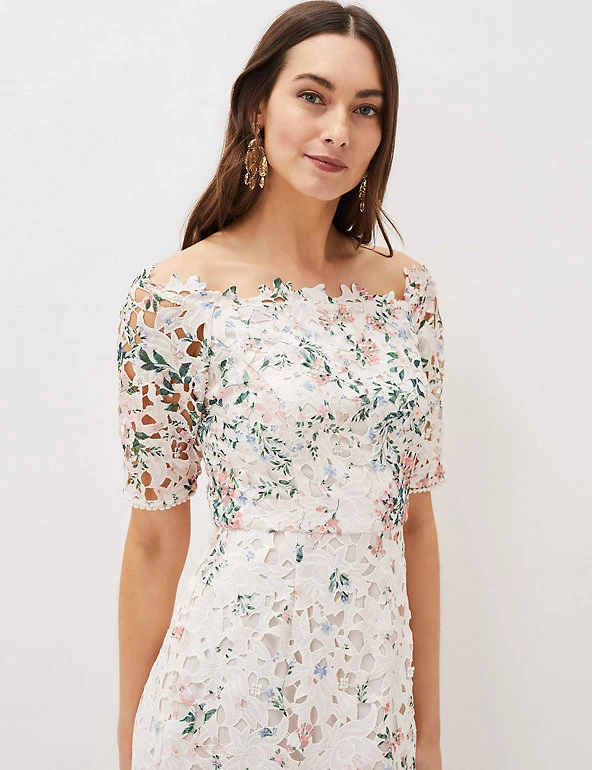 Delicate lace and a soft floral print give this dress from Phase Eight a romantic feel. It’s cut to an effortless regular fit and falls to an elegant midi length. A fitted off-the-shoulder Bardot neckline adds occasion-worthy glamour, and there is feminine scalloped detail across the neck and hem. The dress has short sleeves and is lined for extra comfort. It fastens with a discreet zip on the back.